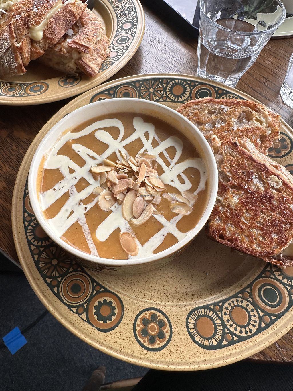 Cheesy toast con zuppa del giorno assolutamente delizioso!