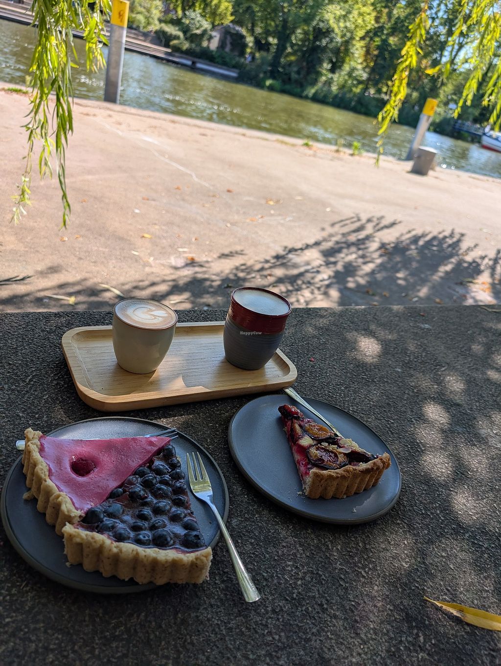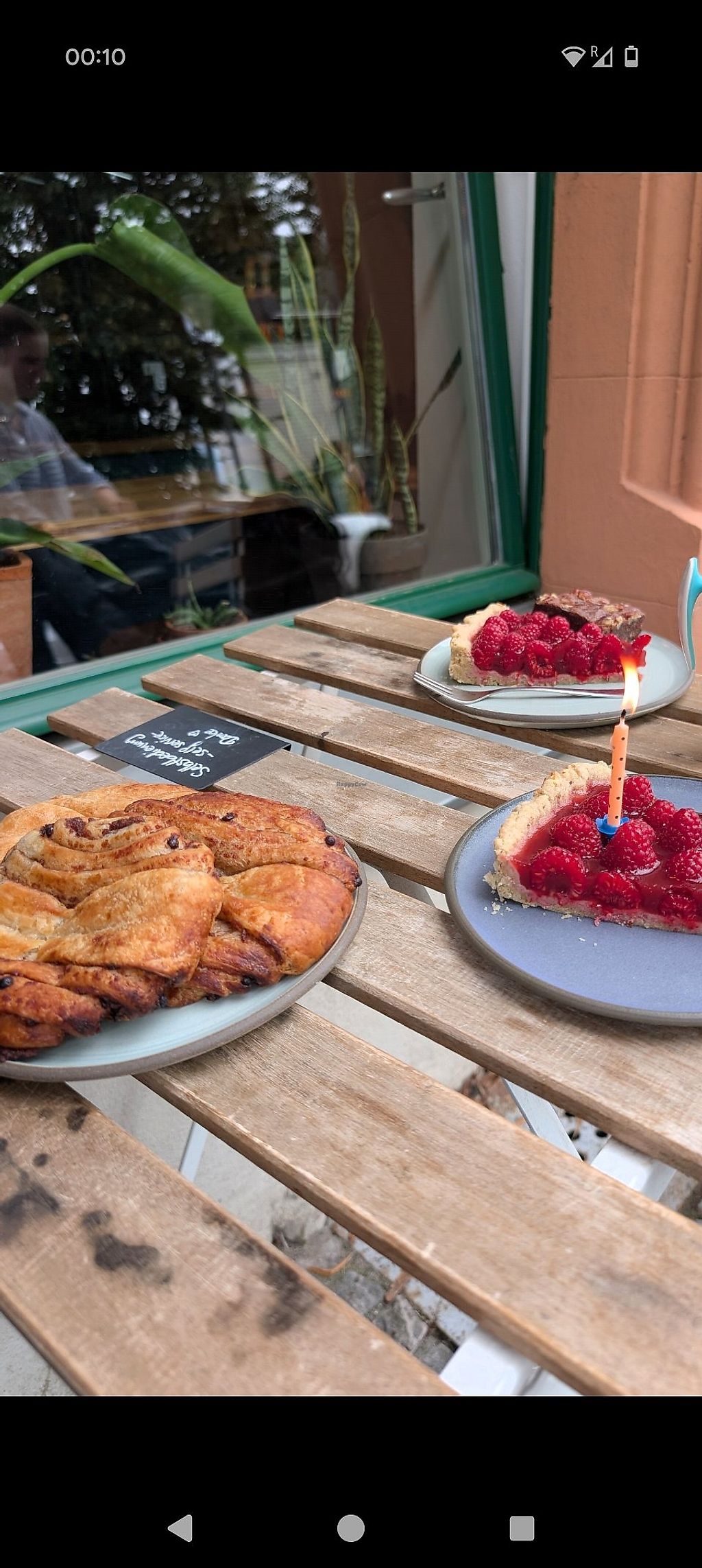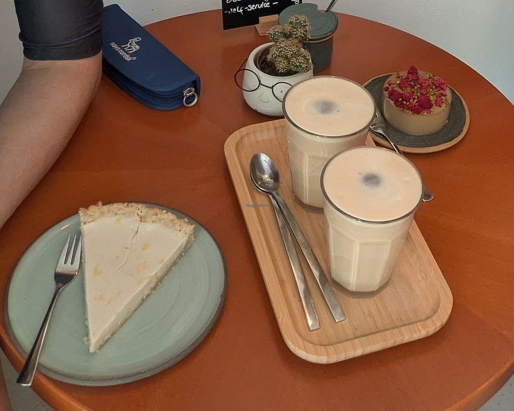 Zitronenkuchen, Pistazien-Törtchen und zwei Iced-Latte