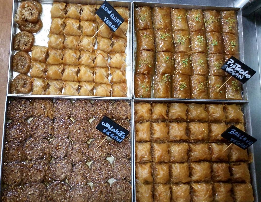 They have a 3 sorts of vegan Baklava and a couple of vegan ice cream flavours, all clearly labelled. Try the chocolate-cherry icecream, it is amazing!!!