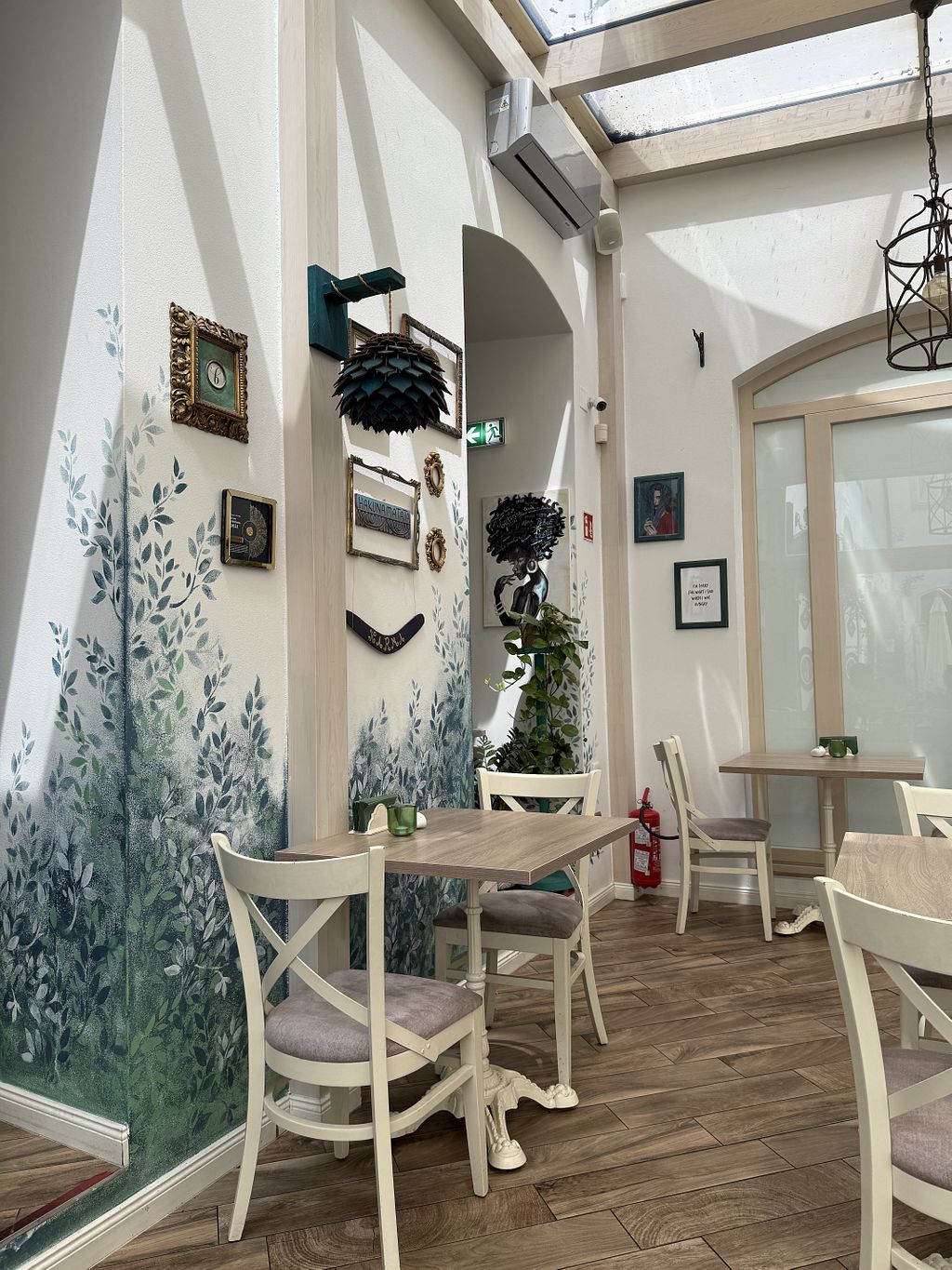 das restaurant liegt in einer kleinen nische und hat einen wintergarten. es ist entzückend eingerichtet und hat viel charm. auch ein kleiner laden ist dabei mit levkeren, ungarischen, veganen sachen (wurst, salami etc.).