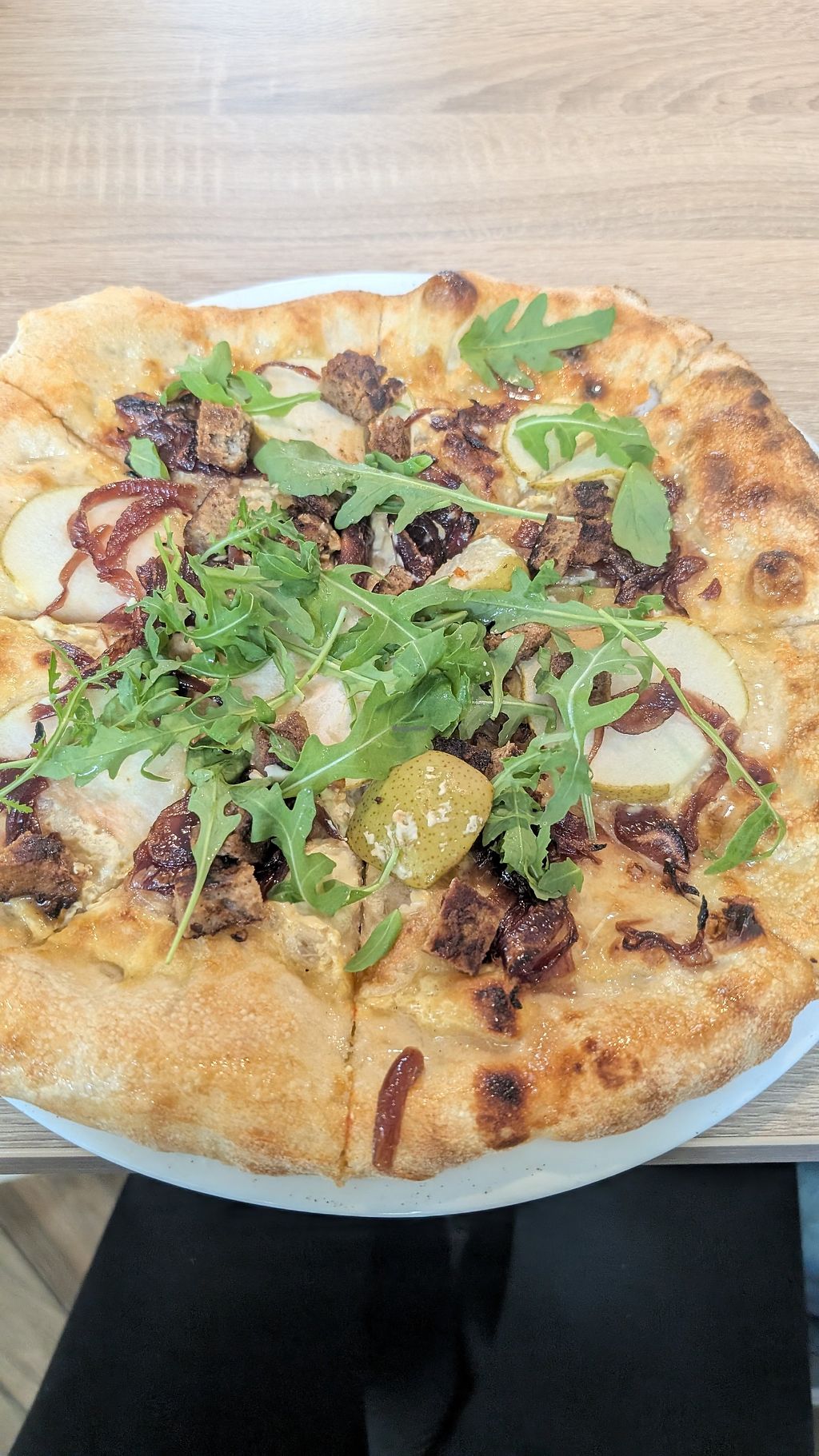 The pizza had no tomato sauce and tasted more like Langos with some Seitan and cheese on top. Not bad, but calling it pizza was misleading.