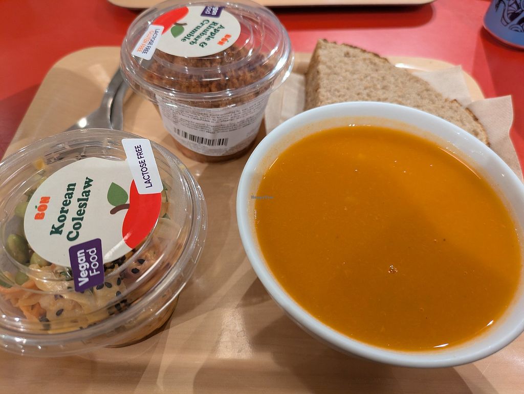 They had 2 vegan bowls, 2 side dishes and a few desserts (1 crumble, a caramel choco slice and power bowls ). I checked and the soup was vegan too, the bread with the risk of contamination. Tasted OK ! Very easy option. They could have specified whether the soup was vegan. Was a bit on the pricier side.