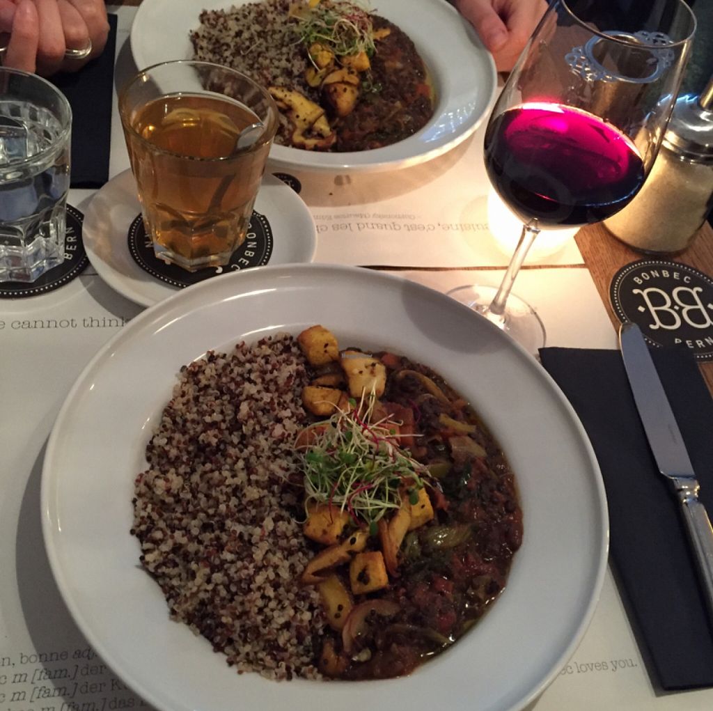 Lentils, quinoa, deep fried tofu, shiitake mushrooms and vegetables.