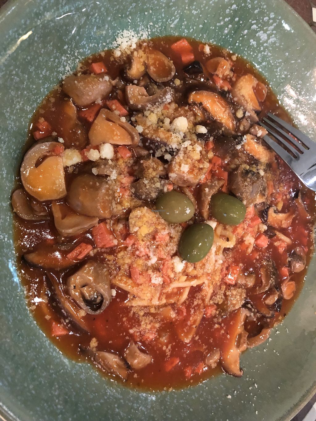 Mushroom curry with yam and carrot. Cracker with mushroom