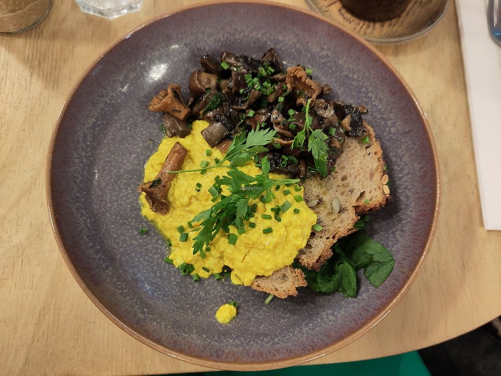 Tofu scramble with truffle mushrooms, sourdough bread and fresh spinac…