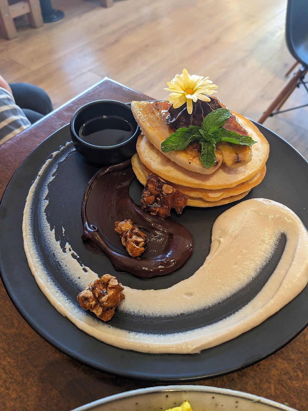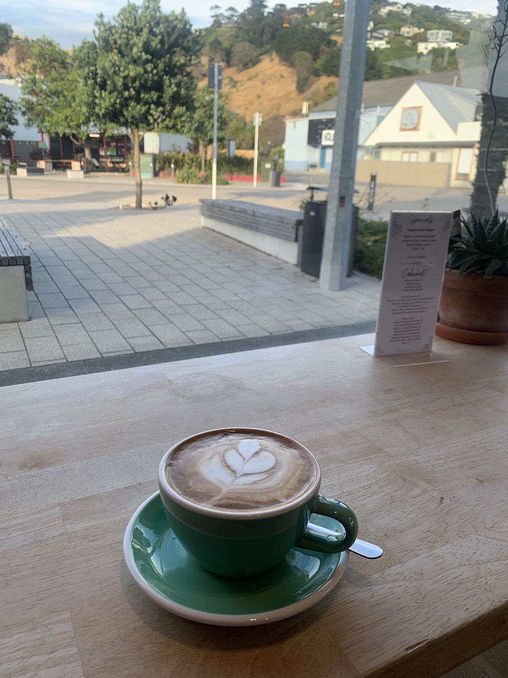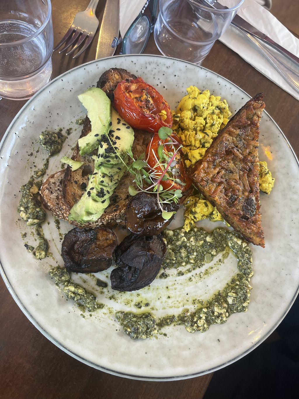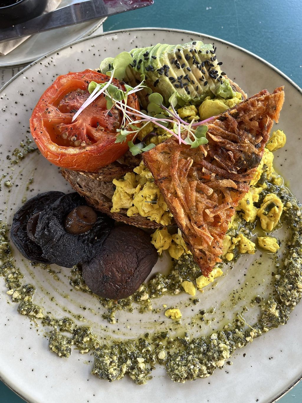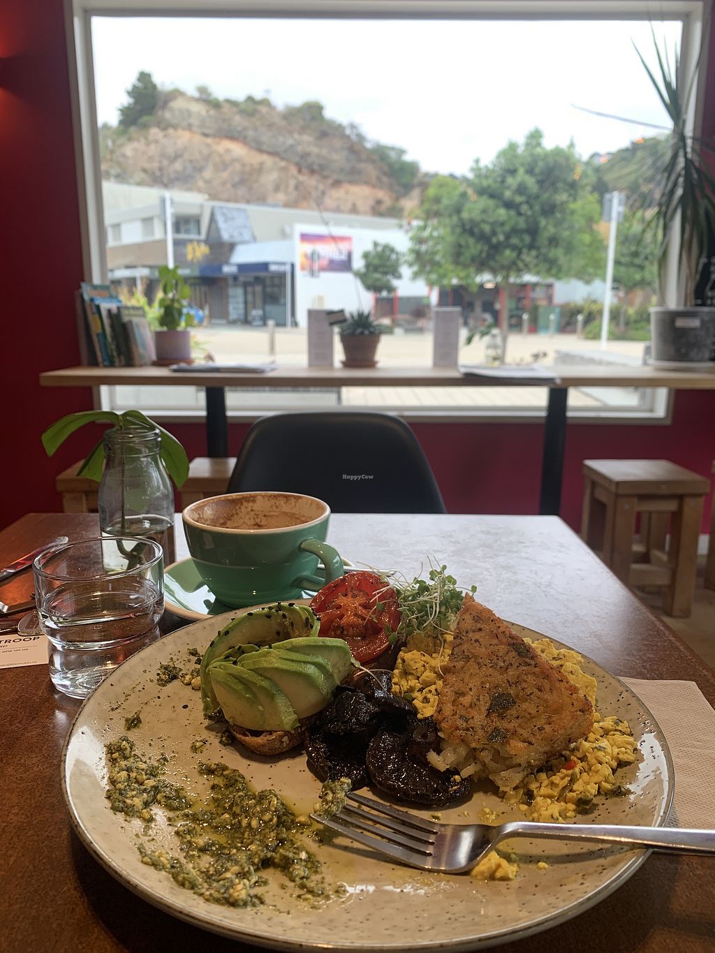 Close up tofu scramble and coconut flat white