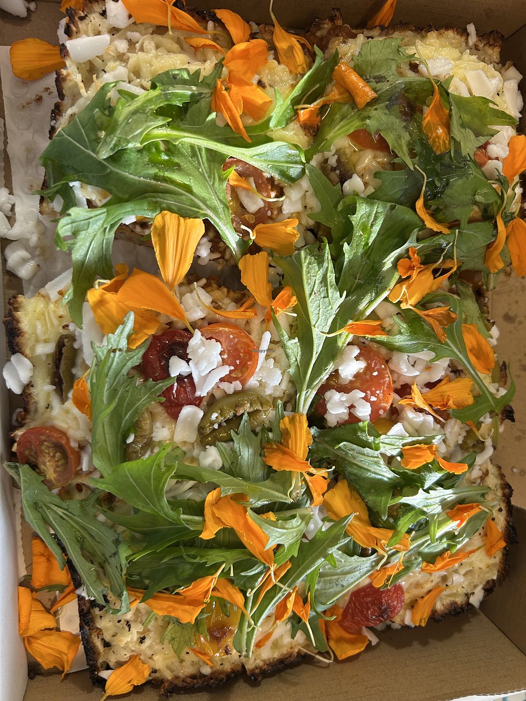 Holy moly, this Detroit style pizza is incredible! The crust is insanely delicious. Two vegan cheeses & edible flowers & absolutely the freshest of toppings! My new local favorite pizza!
