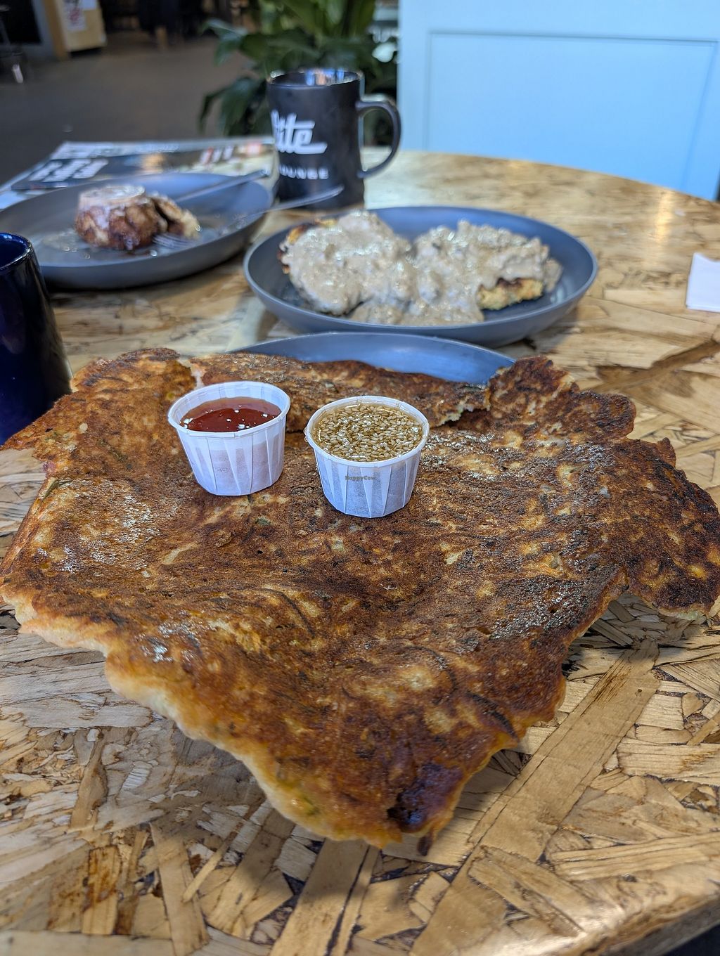 Also tasted my partner's pumpkin waffle and my mom's buckwheat pancake. They were both fantastic and the chai butter was amazing. Highly recommend getting those if you want something dependably good, made fresh, and served at the right temp!
