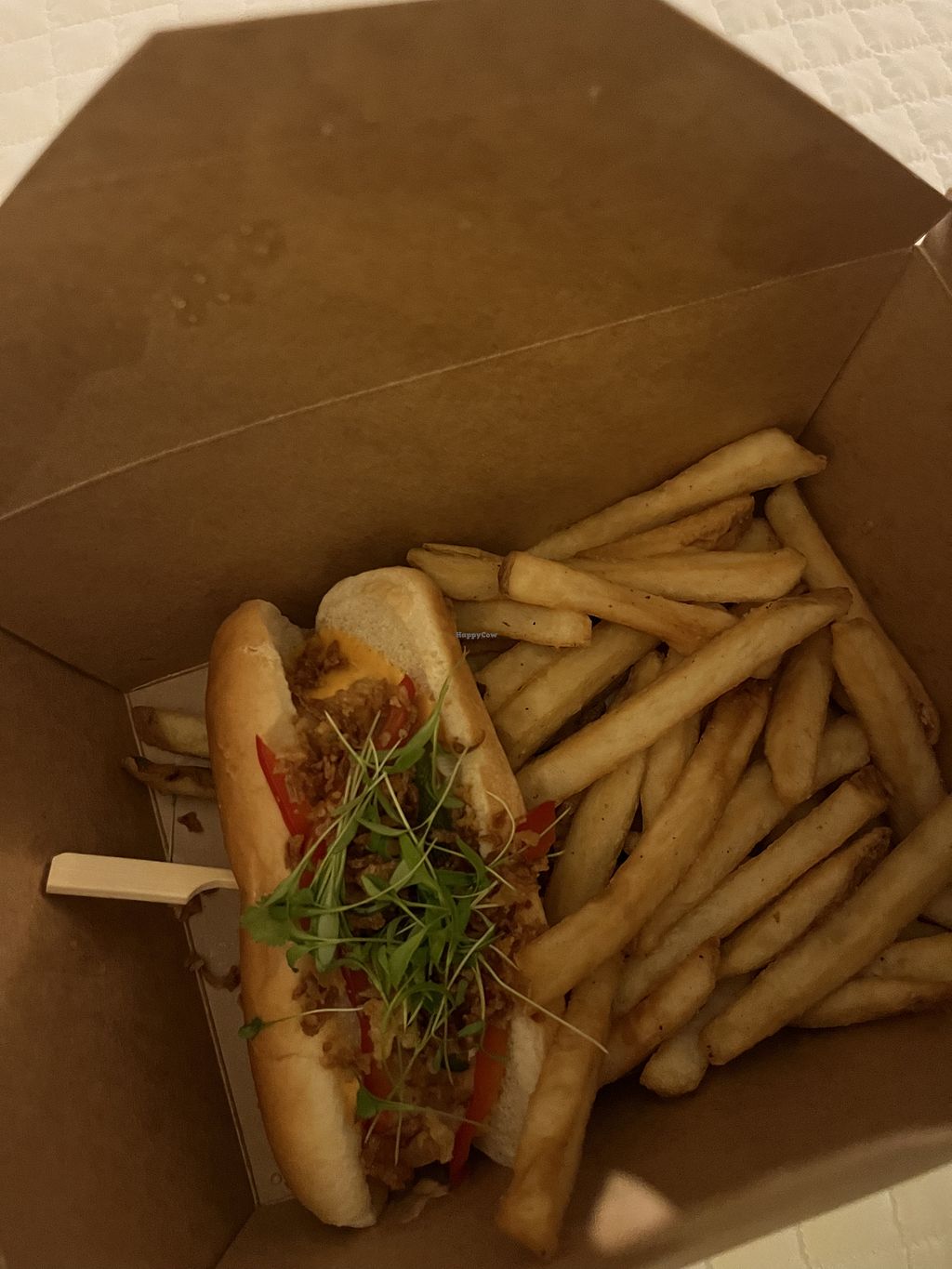 Read moreHappy hour 3-5 every day, I had the vegan hot dog I’m pretty sure they use the spicy beyond sausage, it was messy and delicious.