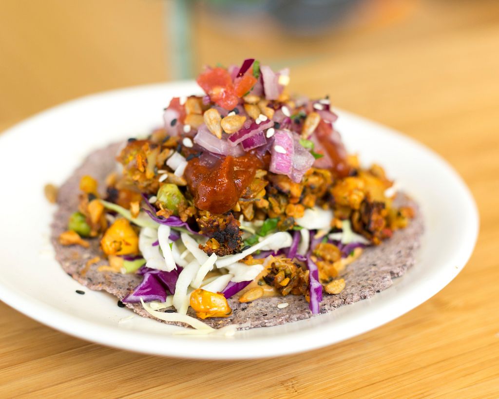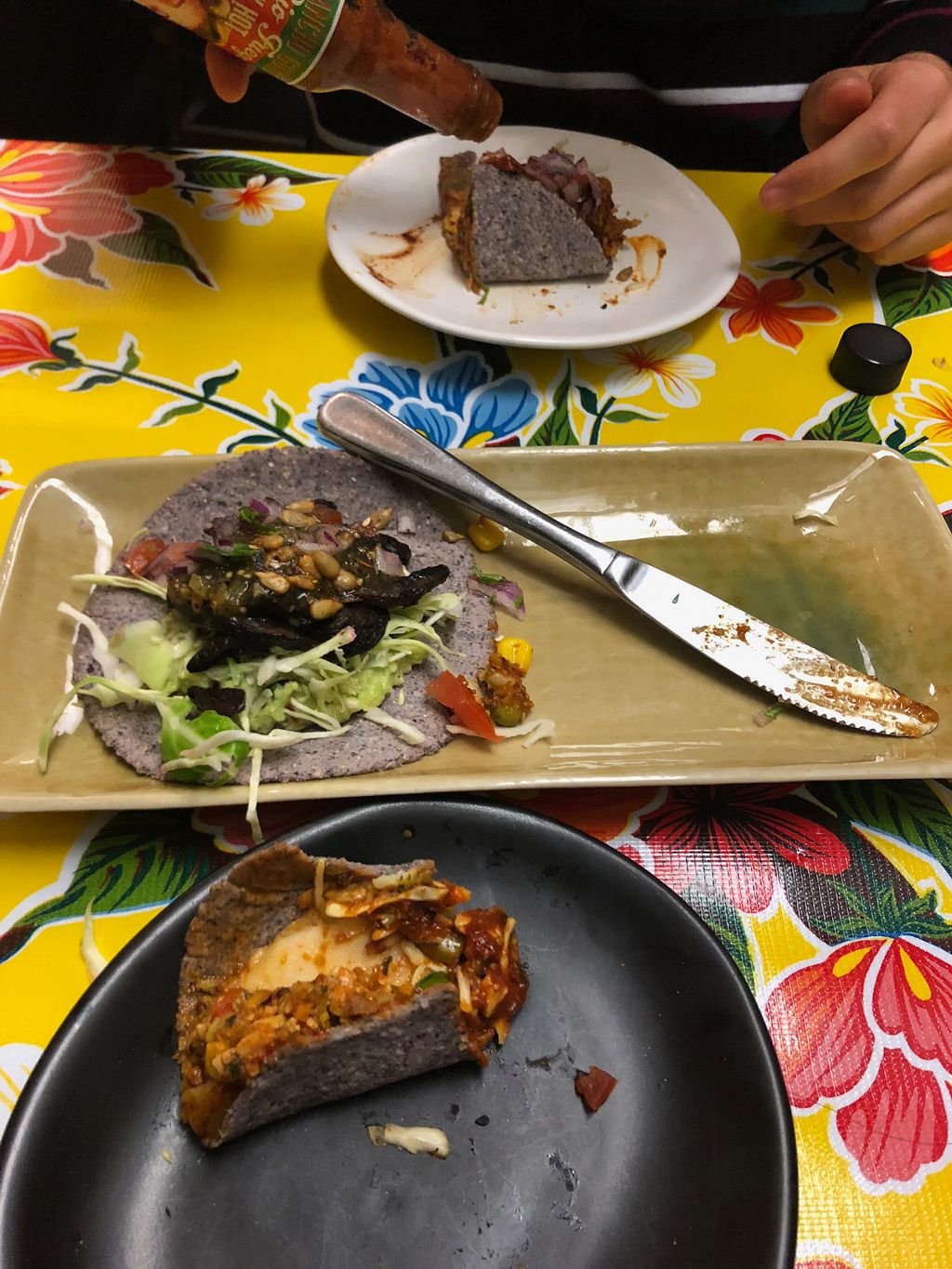 Tofu, Mushroom, Potato & Cauliflower Tacos and Sunflower seed salad