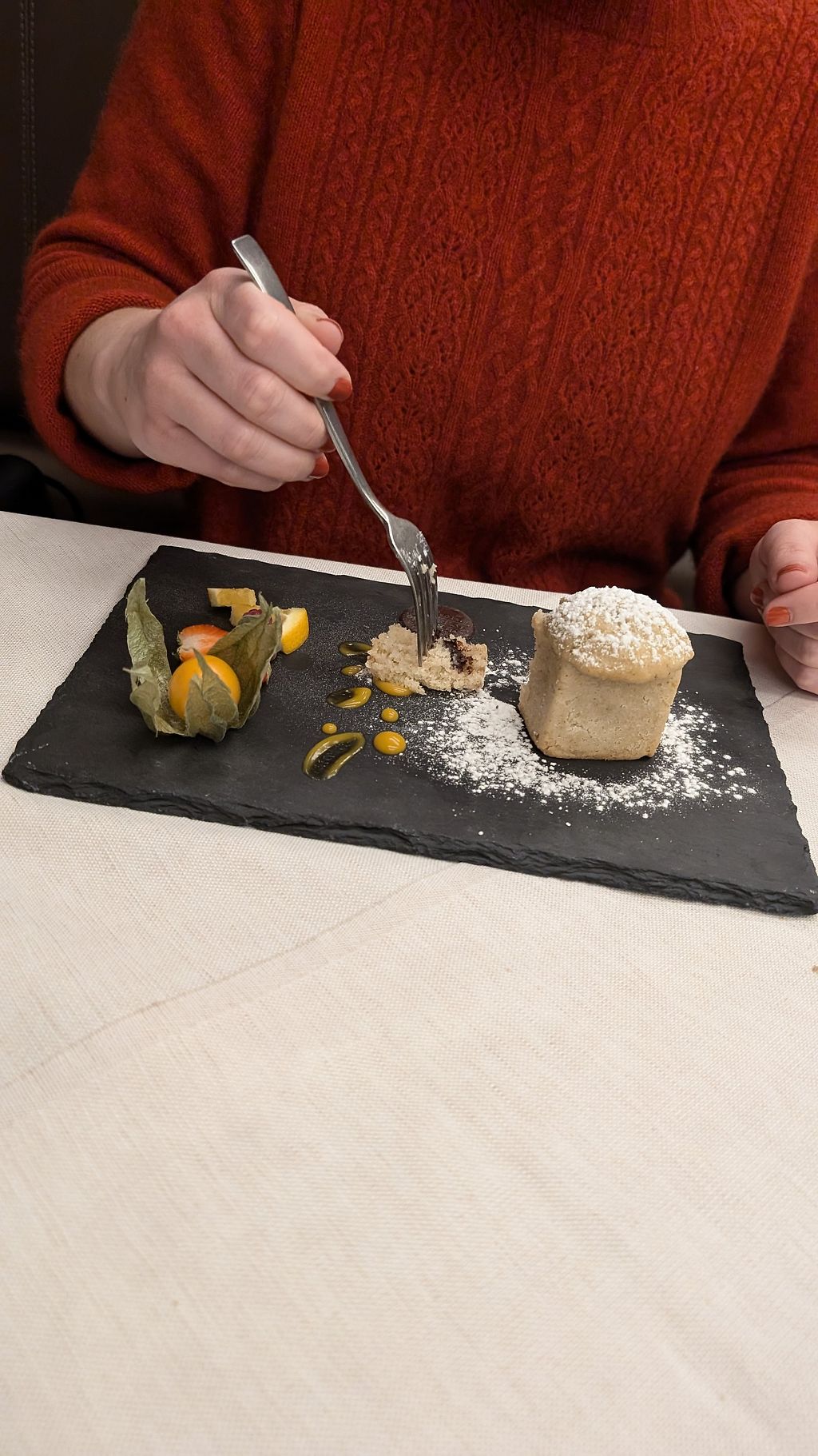 Serves meat, vegan options available. Italian restaurant offering a vegan menu with lentil & apple soup, gnocchi, mixed vegetables, sweet & sour vegetables, cake and biscuits. Open Wed-Sun 19:00-22:00, Sun 12:00-14:30.