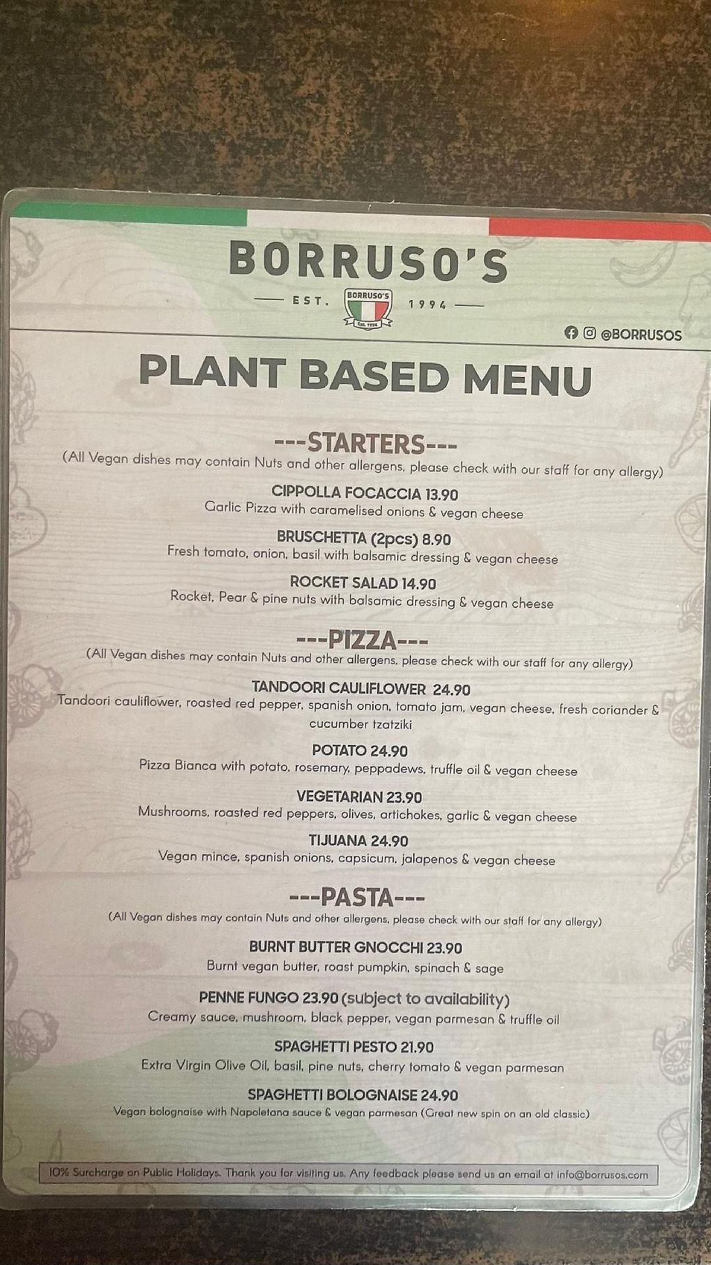 After reading the reviews, we thought we'd give this place a go. My partner and I visited Borruso's. We came in at midday. It was pleasant. The seats were comfortable. The table was secure. What was great was that they offered a vegan and plant-based menu.