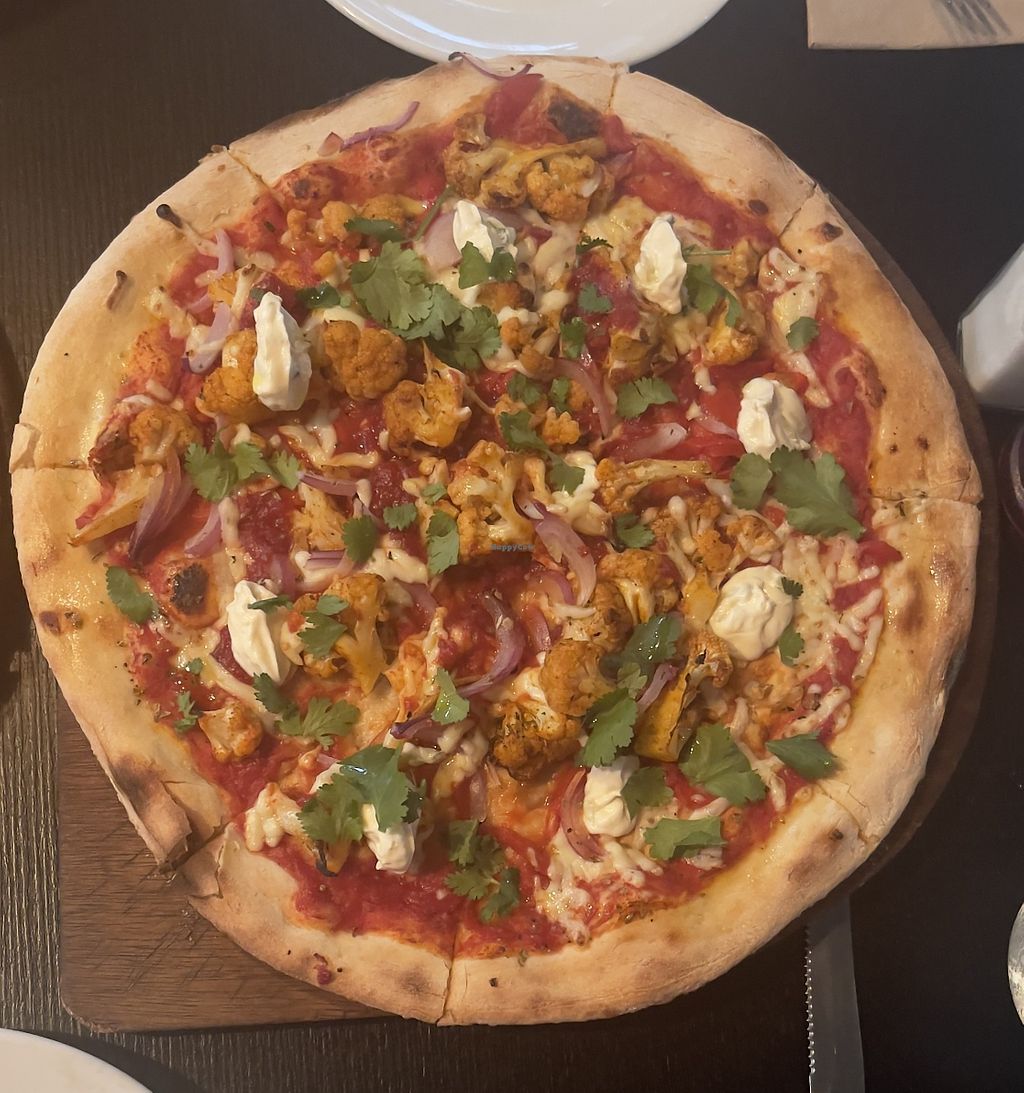 • Tandoori Cauliflower (Tandoori cauliflower, roasted red pepper, Spanish onion, tomato jam, vegan cheese, mint and cucumber dressing and coriander)