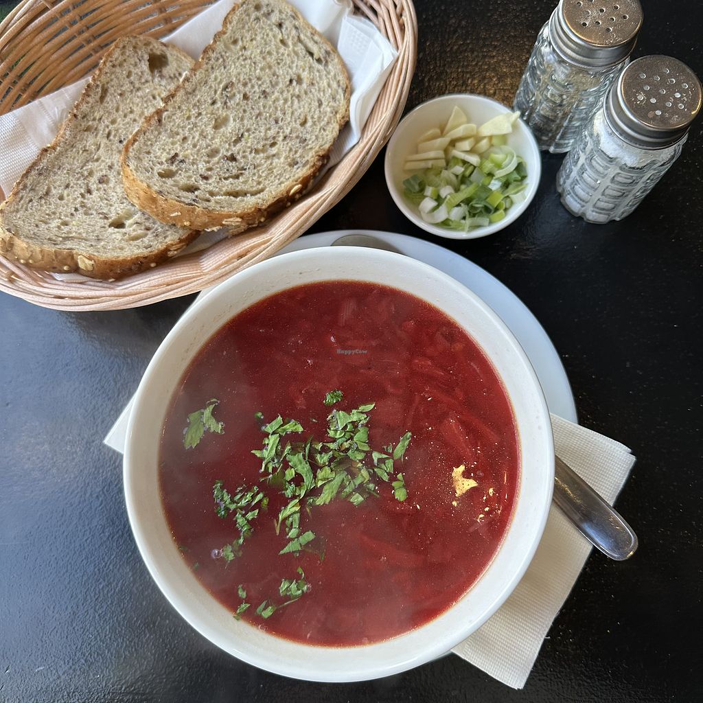 Serves meat, vegan options available. Restaurant offering vegan and veganizable dishes like red or green borscht (beet or vegetable soup), varenyky (Ukrainian dumplings) with fillings such as potato, mushroom, cabbage, vegetables, or sauerkraut, and kasha (toasted buckwheat groats). Open Mon-Sun 11:00am-11:00pm.