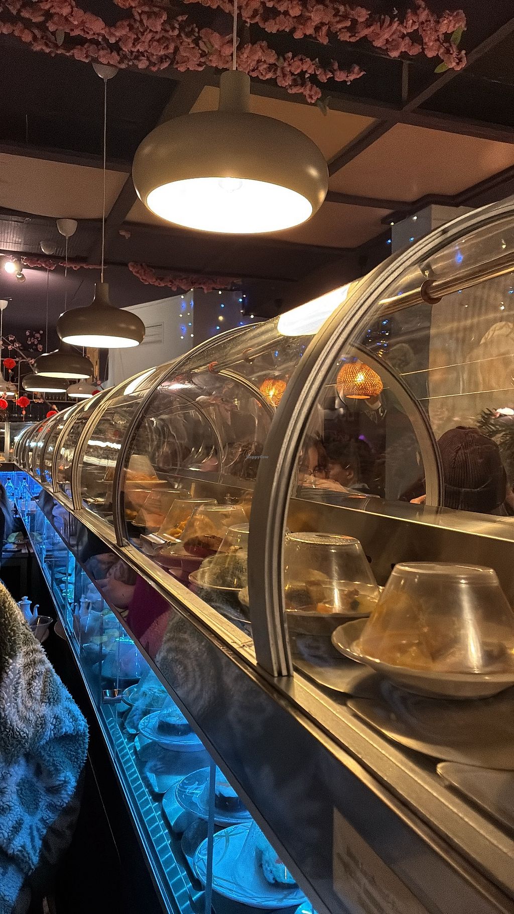 Running Sushi in vegan. Leider keine riesige Auswahl und manche Sachen haben etwas langweilig geschmeckt. Trotzdem super experience für angemessenen Preis