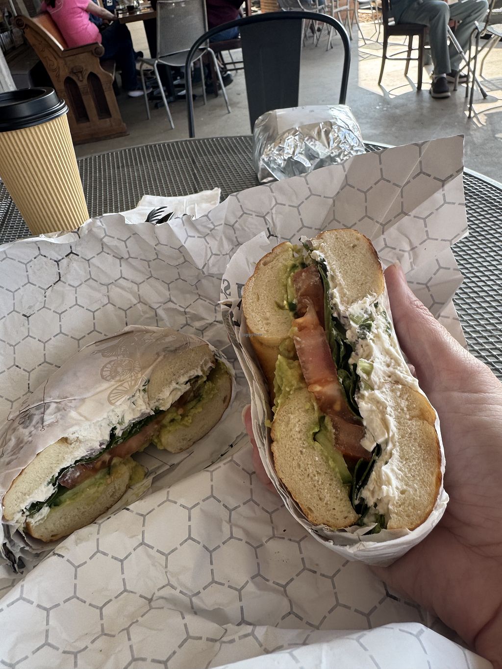 Everything bagel with green onion tofu schmear tomato red onion and le…