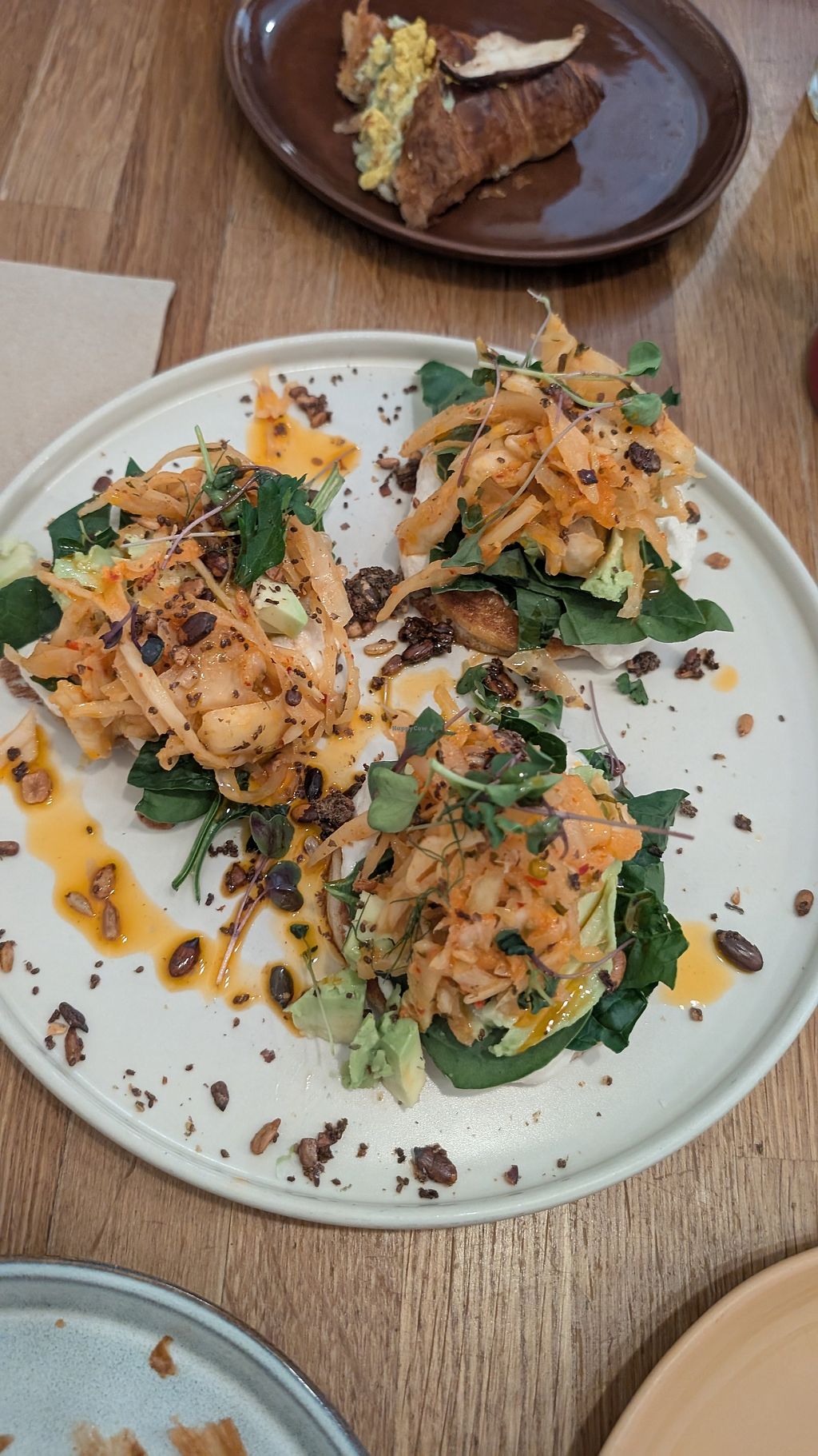 We just had to come back from brunch for the second time. Kimchi blinis were ok. They had forgotten the avocado by mistake, but once they realized I got a delicious avocado on their sourdough bread (so simple but yet so good). Friendly staff.