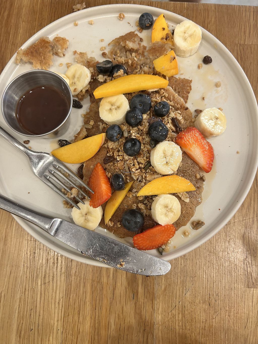 Pros: Being greeted kindly, Oatmeal with peanut butter and fruit, Pancakes with chocolate