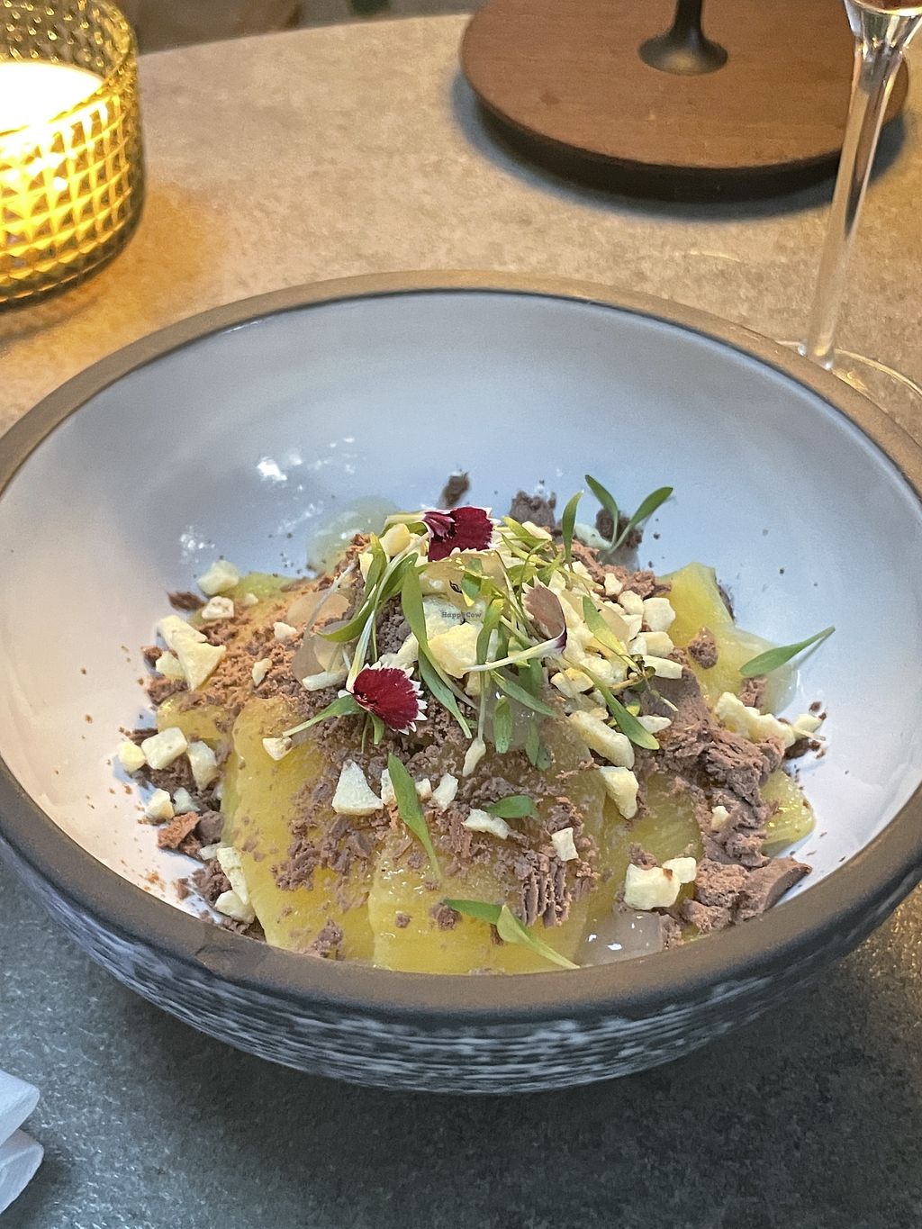 We returned to this delightful restaurant after a year. The menu may have slightly changed but the service was still absolutely tip top alongside creative dishes that tease the tongue. We again chose the vegan taster menu and we were not disappointed. This time we were accompanied by friends with differing dietary requirements to ourselves and they were easily accommodated. The portion sizes were rather petite but that is to be expected with a taster menu; sadly, because each course leaves you greedily wanting more. And more. And more! This is a charming restaurant in winter but in warmer weather, I am told the courtyard is simply a must, and confirms why this is a destination restaurant for all.