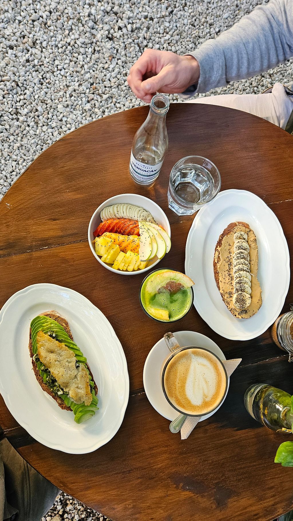 Peanut butter toast with banana and agave syrup.