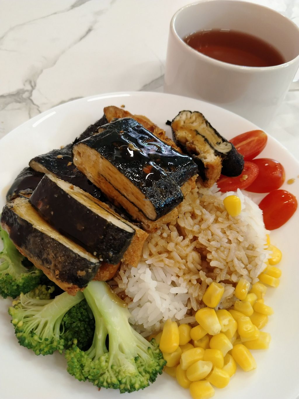 Teriyaki fish rice with hot nutmeg drink. Promo set $7.50