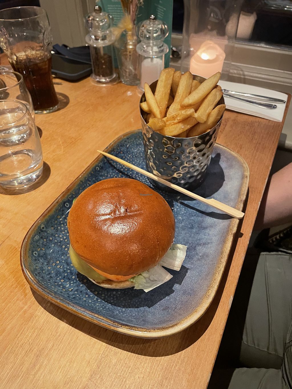 Having made a booking for dinner, I'd looked at the menu online earlier that day (correction: turned out to be an old menu) and was happy to see a tasty-looking vegan main, but when we were there the menu was different. That shouldn't have been a problem except there were no vegan-labelled mains. Loads of stuff labelled "Vg" from starters, to toppings, to wines, just not an actual main course. When I told the waitress she went away then came back saying the "Vg" symbol denoted vegan, so I had to explain again that that wasn't the issue but the lack of vegan mains. Eventually she came back with vegan options but I felt difficult having to ask questions. I managed to get sausage and chips which were okay but nothing special. Veg was very salty and while they did ask us as a table if we wanted condiments, they didn't give us as individuals a chance to answer, so we got one little pot of ketchup between 3 of us. The staff were smiley and friendlier than in a lot of establishments, but service was slow and ordering as a vegan felt too much like hard work. The frangipane dessert was nice. I didn't get the second drink I ordered and there was a separate mistake in the bill that took a while getting rectified. I wouldn't go back.