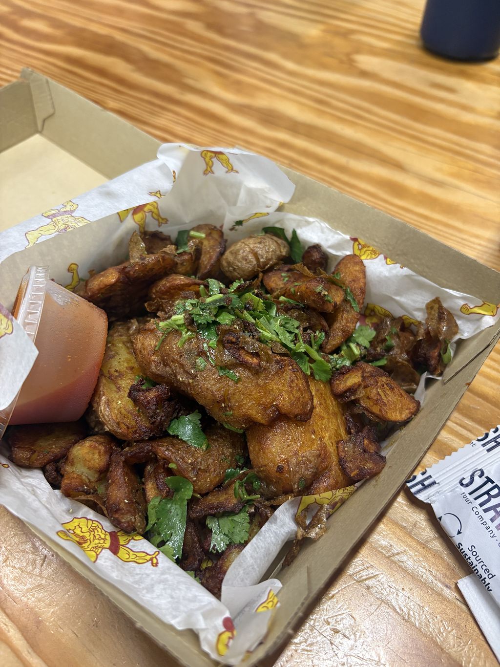 Serves meat, vegan options available. Trendy counter-serve restaurant offering Indian street food with vegetarian options such as bhel puri, masala smashed potatoes, gobi 65, and okra fries. Open Mon-Fri 11:00am-9:00pm, Sat-Sun 11:00am-10:00pm.
