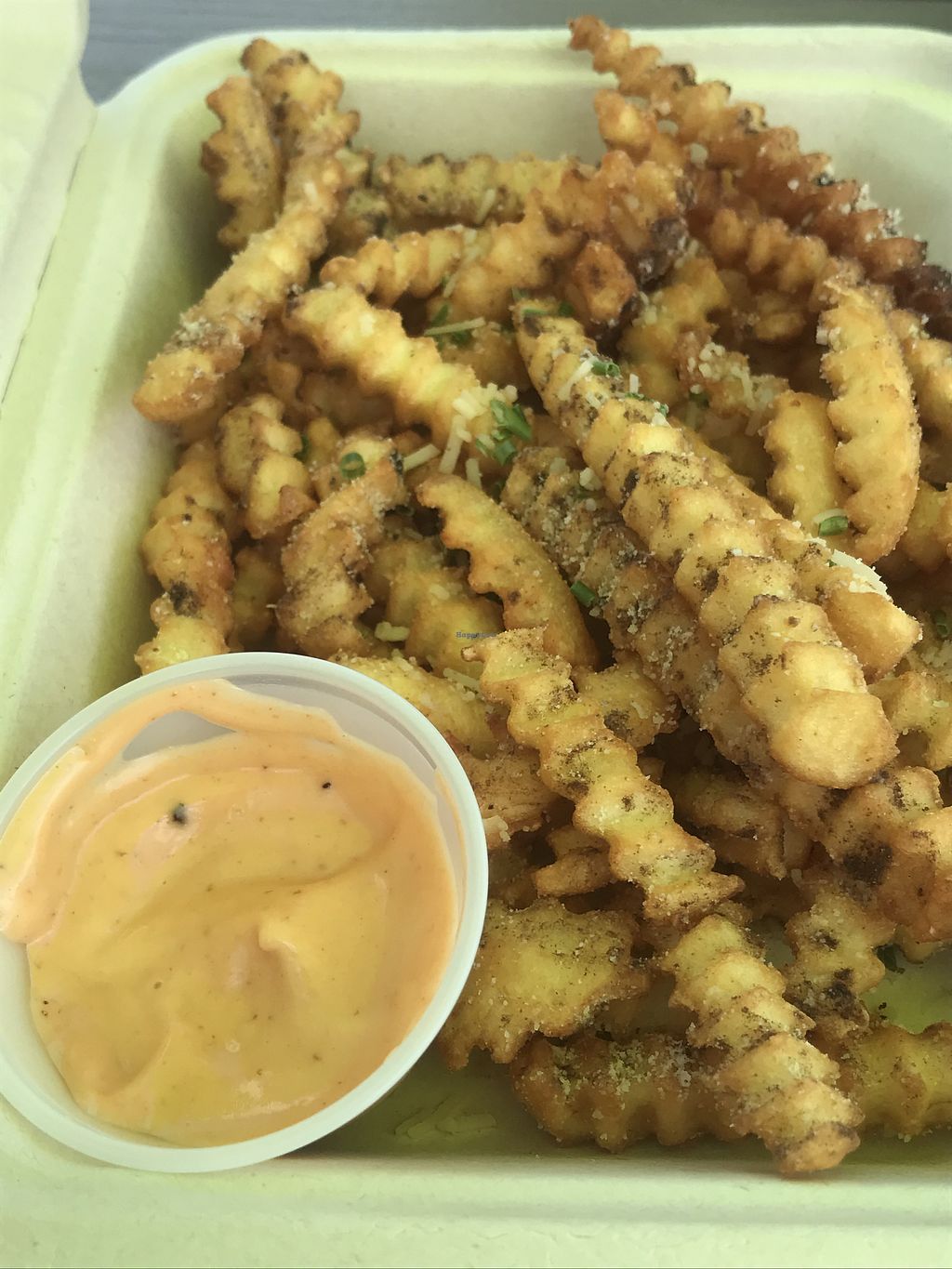 The fries were good and seasoned perfectly. The jackfruit nachos weren't good unfortunately. The cheese wasn't good and the jack fruit had a lot of hard pieces that should've been removed when cooking. However the chicken sandwich was one the best faux chickens I've had. Facebook page needs to be updated with correct operating days/hrs.