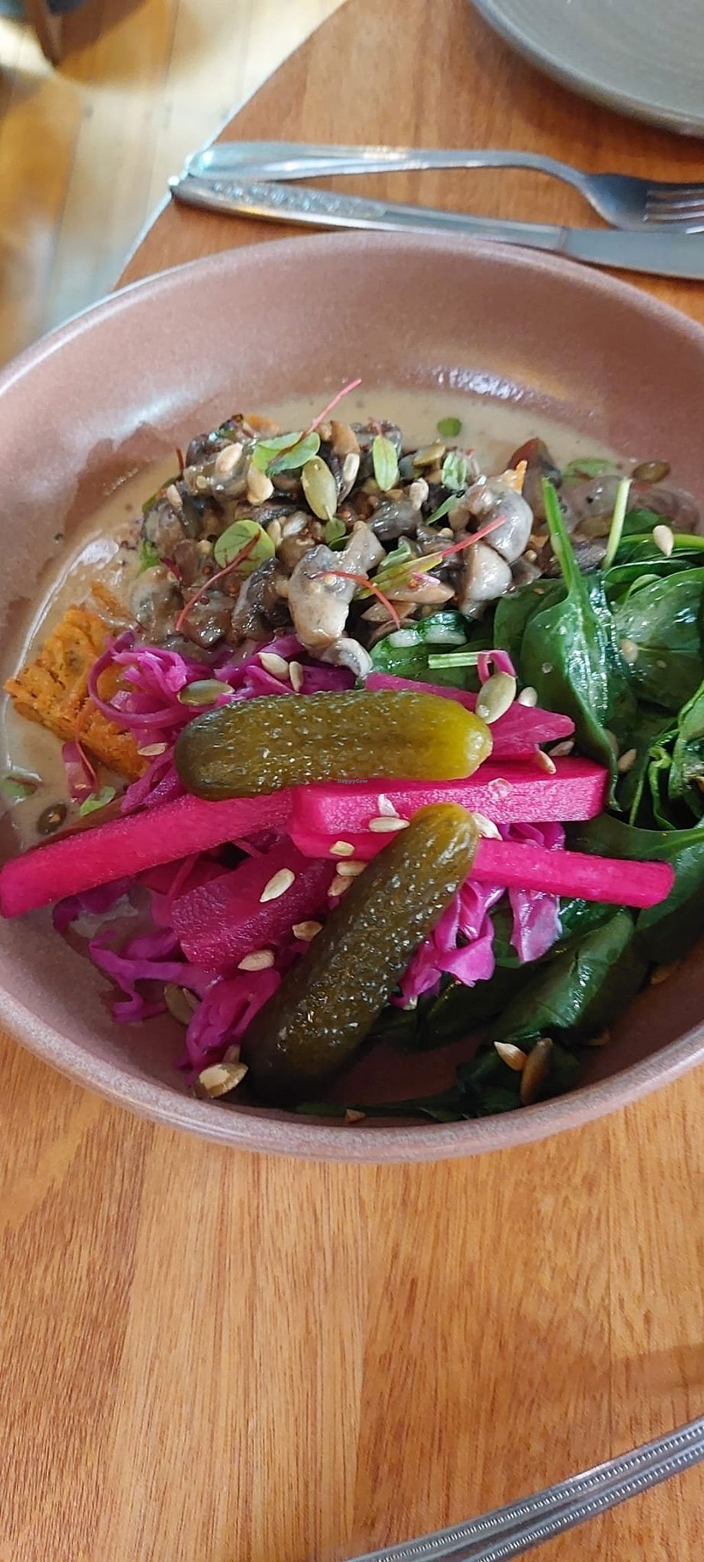 We had the mushroom loaded hash brown (very tasty, good size) and the vegan shakshuka (tasty, with a kick).