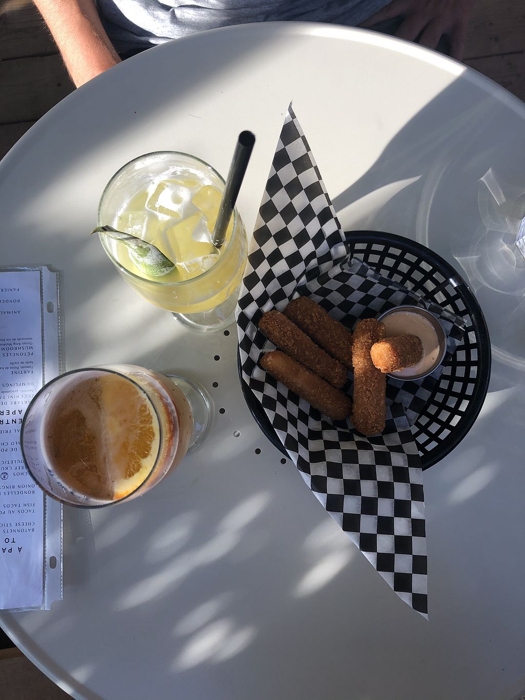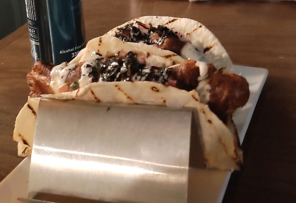 Properly developed vegan junk food menu! The servis people were smiley and very hard working. They outdoor seating area. Food is really good. I had fish tacos, it was a deeeeeep fried something and delicious. Also we asked for buffalo wings which was a hit too salty but still yummy. Margarita was really good as well.