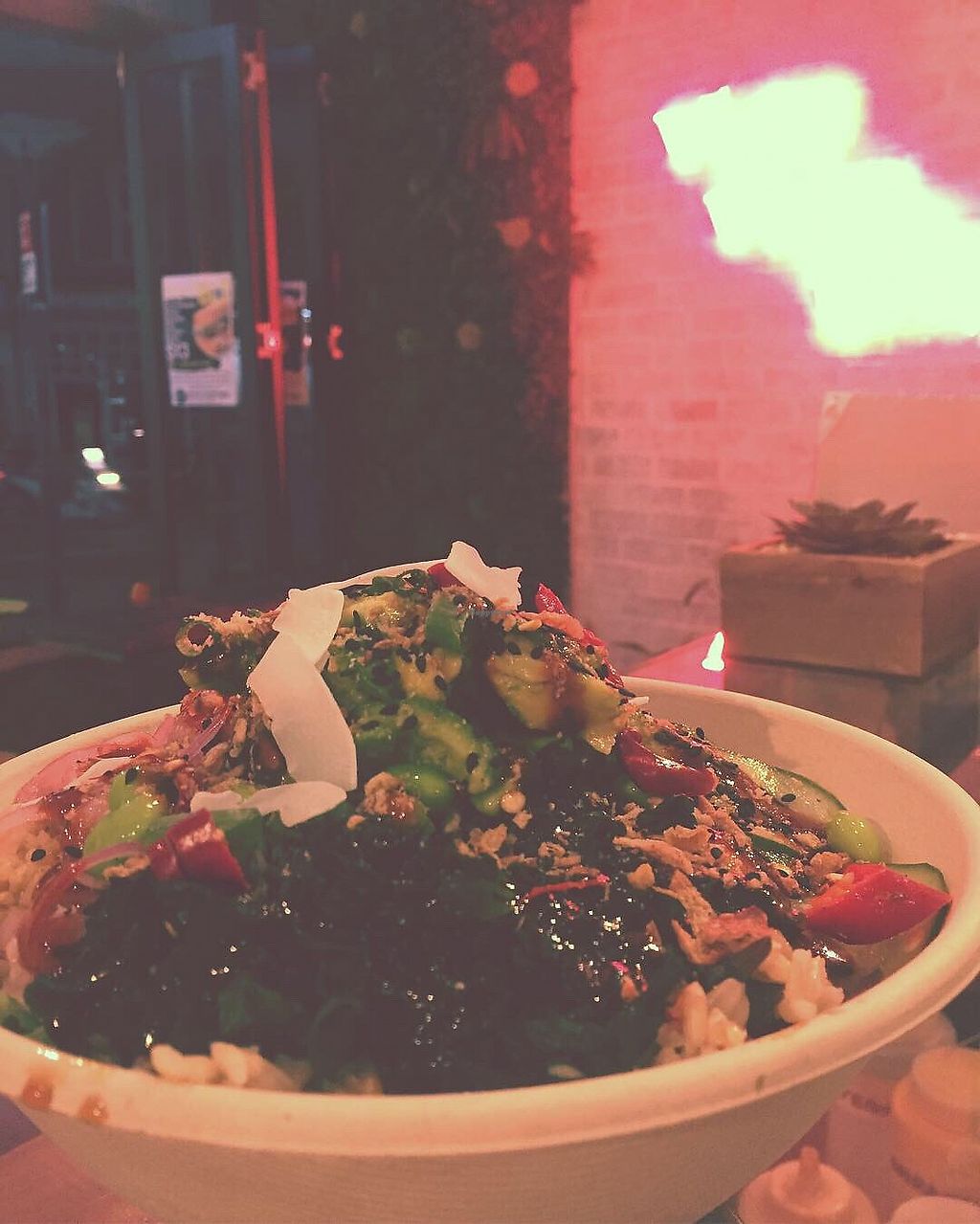 Serves meat, vegan options available. A poke bowl cafe that offers a wide range of poke bowls, build your own bowls, vegan smoothies and bowls, salads and vegan dumplings. Has vegan cheese. Reported closed December 2020.
