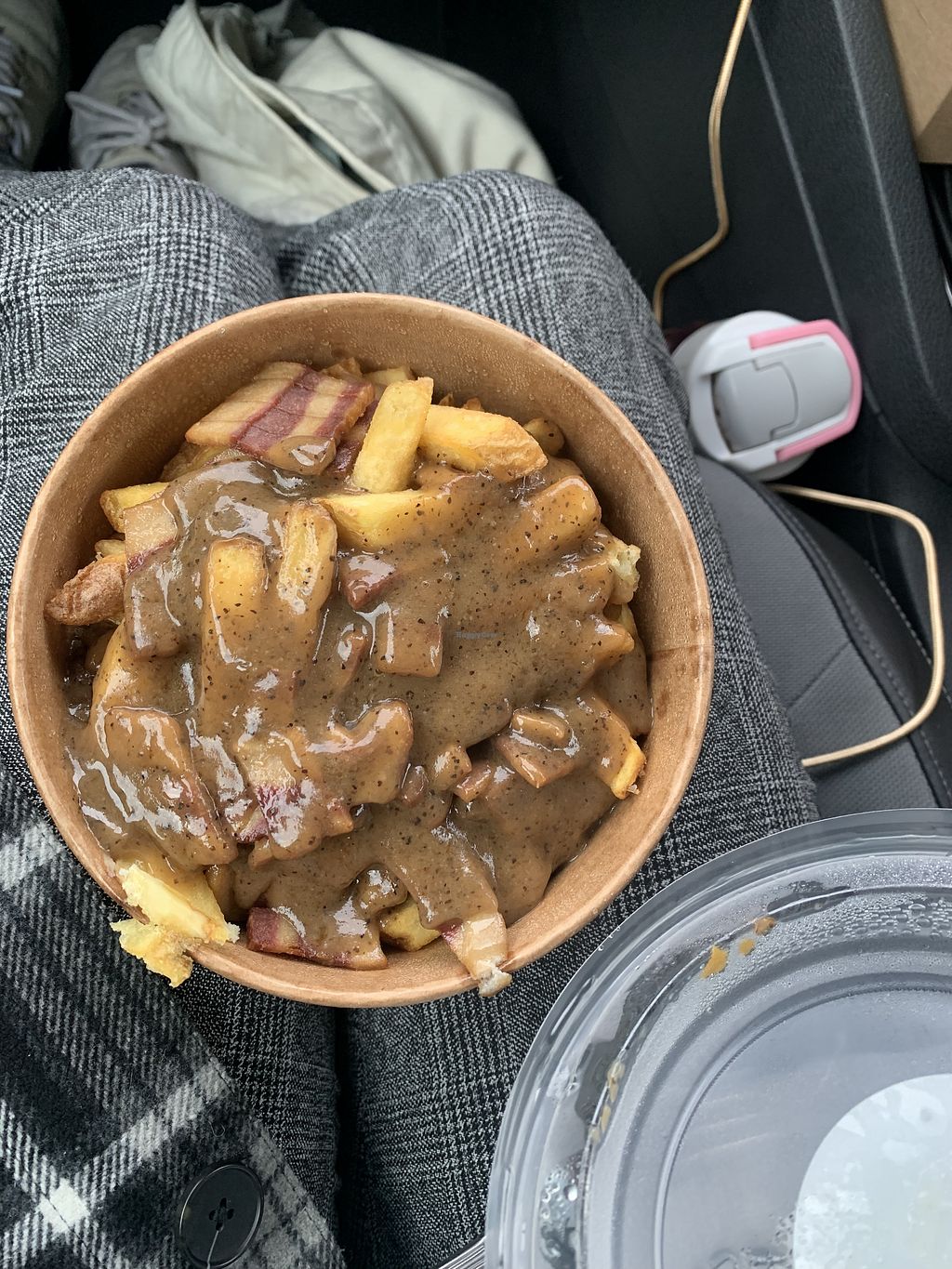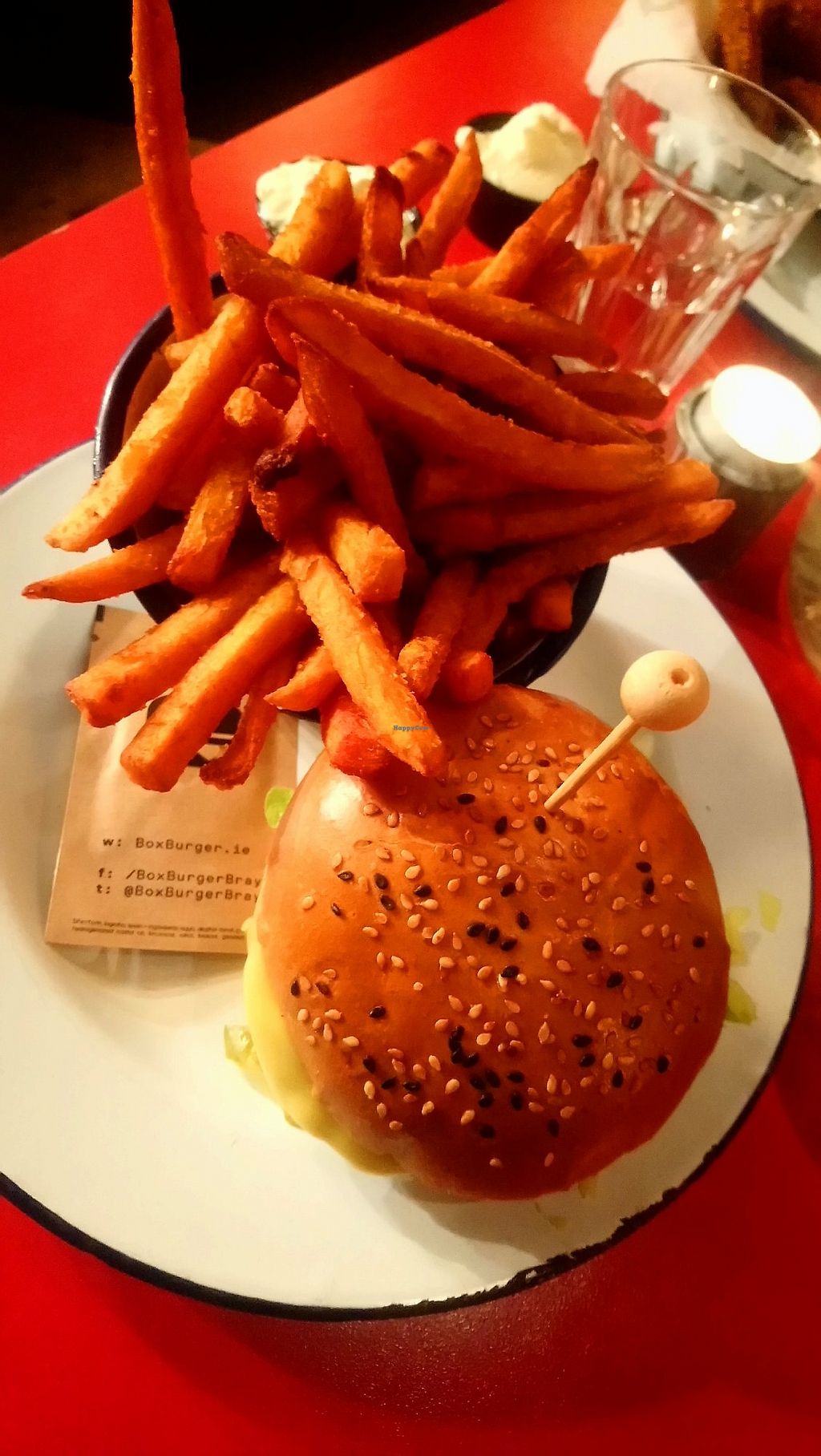 Vegan burger with seitan patty, vegan cheese and bun. Sweet potato fri…