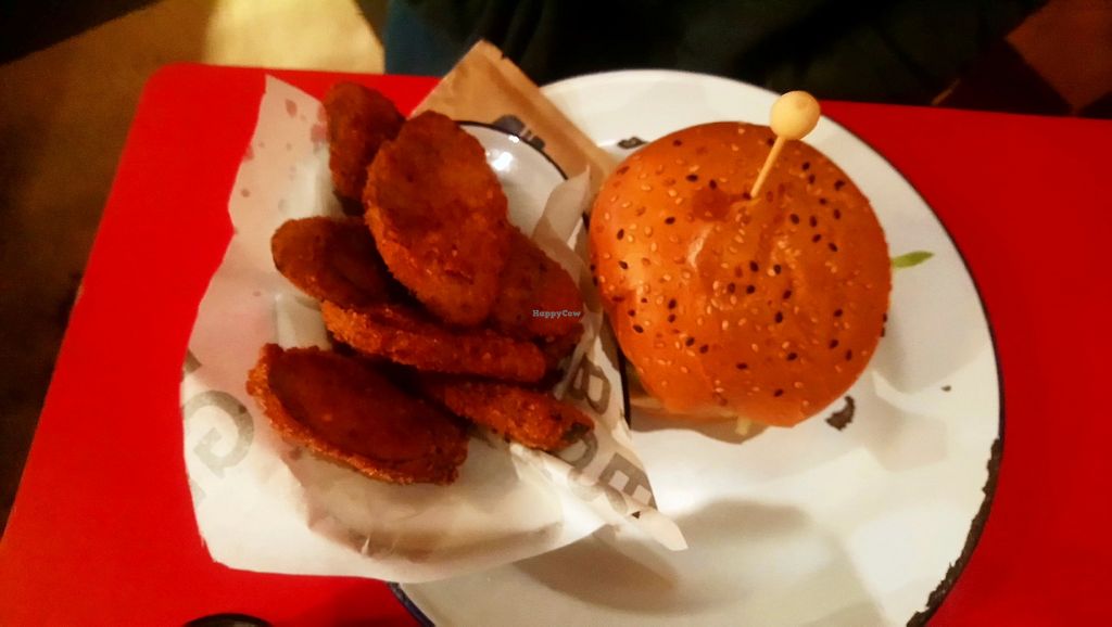 Frickles and seitan burger