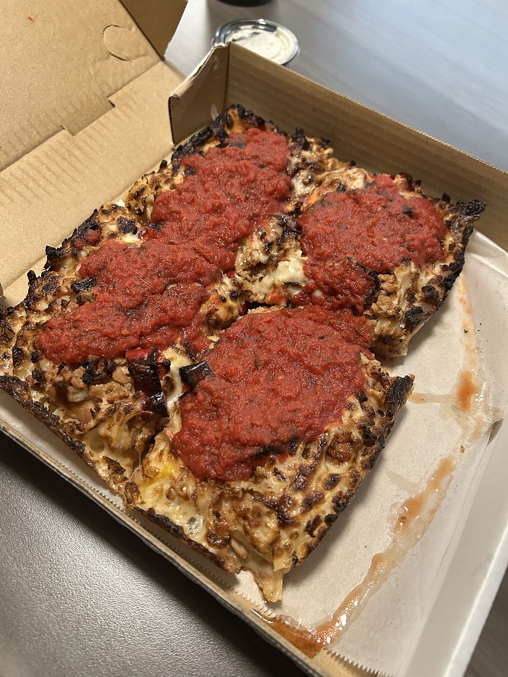 I usually like a simple cheese pizza and tried a menu option that seemed closest to that. Found the cheese flavors unpleasant (one was overwhelmingly tangy, another was flavorless). The dough was alright, but Detroit style may just not be my thing. I didn't even finish my half of the pizza because it started feeling like a project.