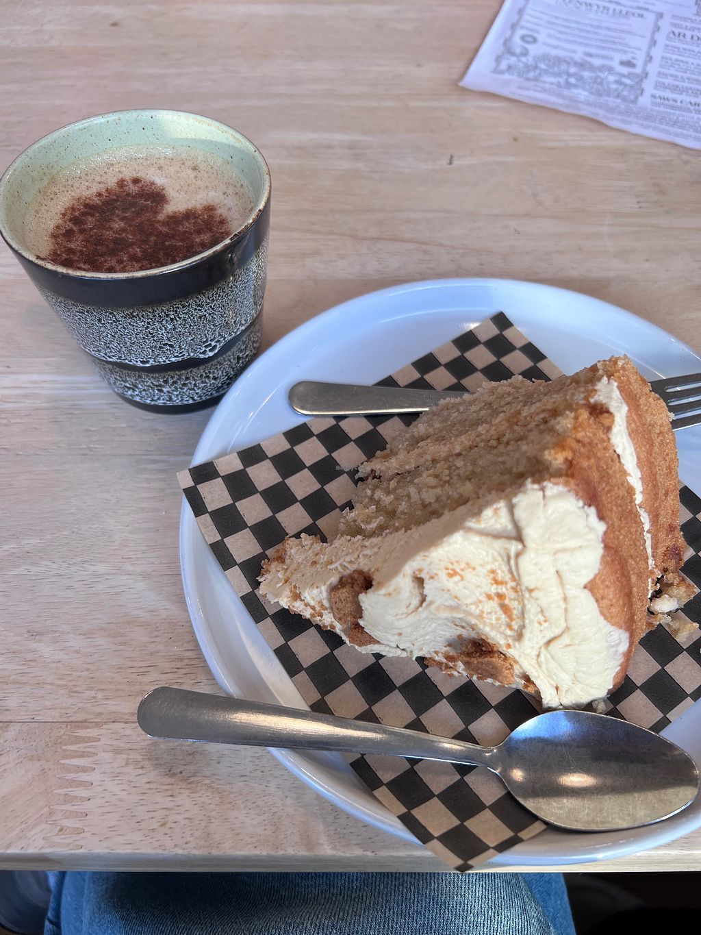 We arrived at lunch time and they offered a vegan soup, vegan salad, a foccachia with vegan feta and some kind of a sharing cheese plate (with vegan feta and cheddar they told us). But we went for the foccachia and it was absolutely faboulous,fresh and very special!! An absolute recommendation! Also the side salad with walnuts,grapes,olives and dried tomatoes was yummy! Not to mention the cakes..today they had a vegan Victoria sponge cake and Orange shortbread-yumyum! Their good coffee comes with Oatly milk.
