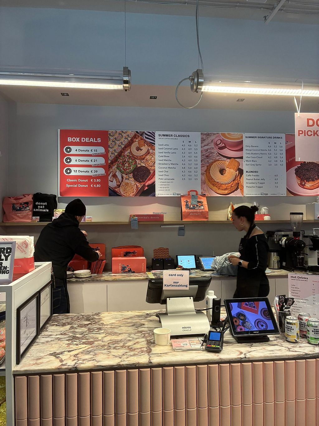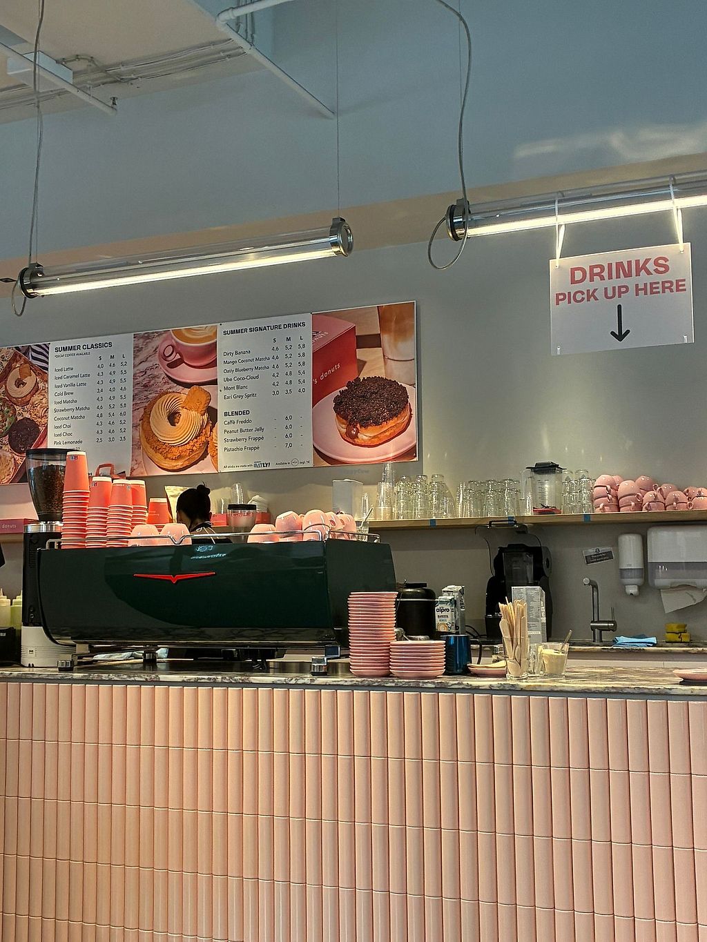 Sehr schön eingerichtet, viel rosa. Gute und schnelle Bedienung. Die Donuts sind sehr lecker aber machen schnell voll, also lieber weniger nehmen als mehr