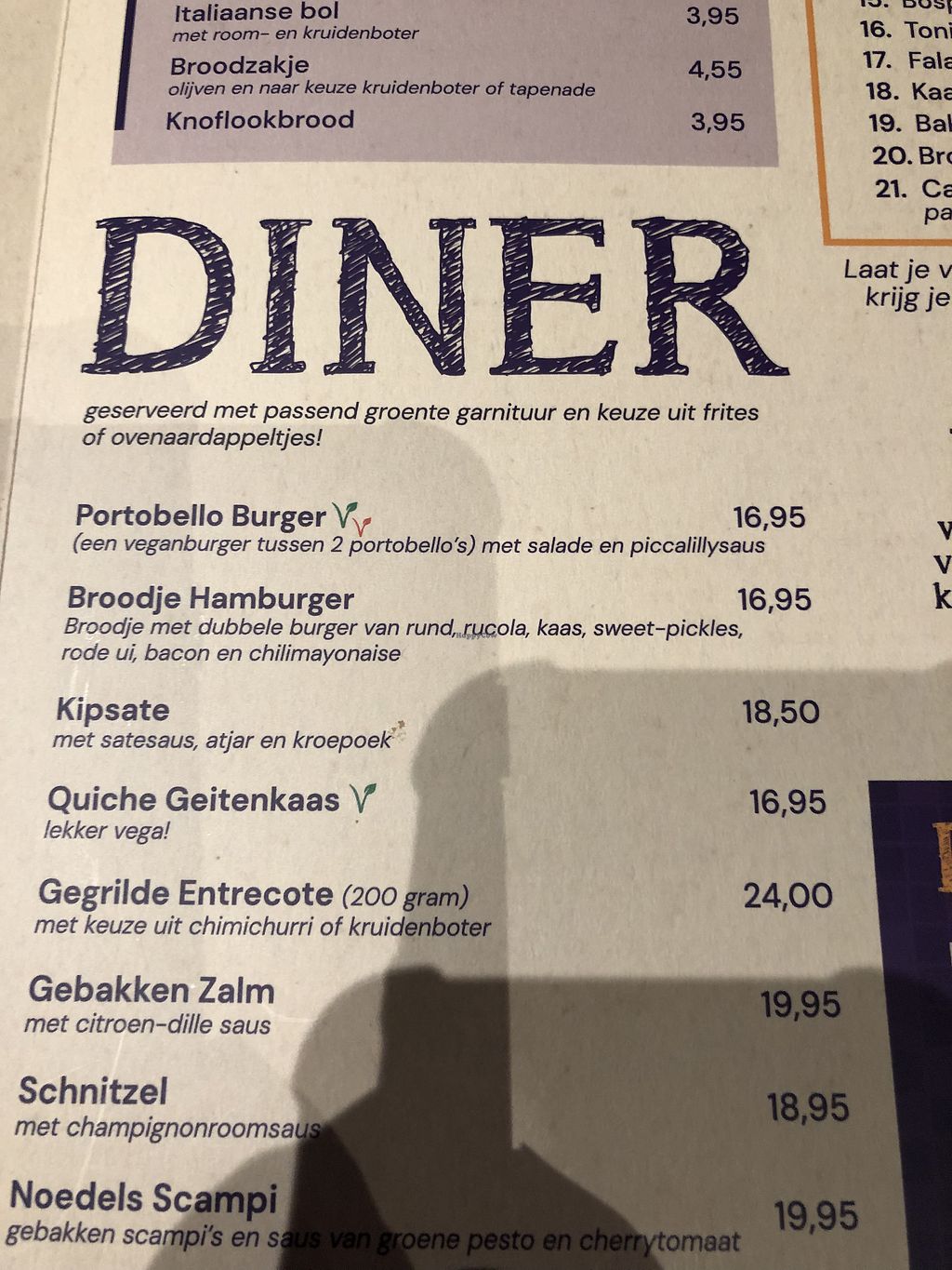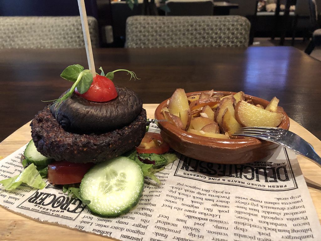 Op de menukaart stond een Portobelloburger met salade. Bovenaan de lijst met dinerdingen stond dat bij alle gerechten een bijpassende groentengarnituur en aardappeltjes/frites werden geserveerd.