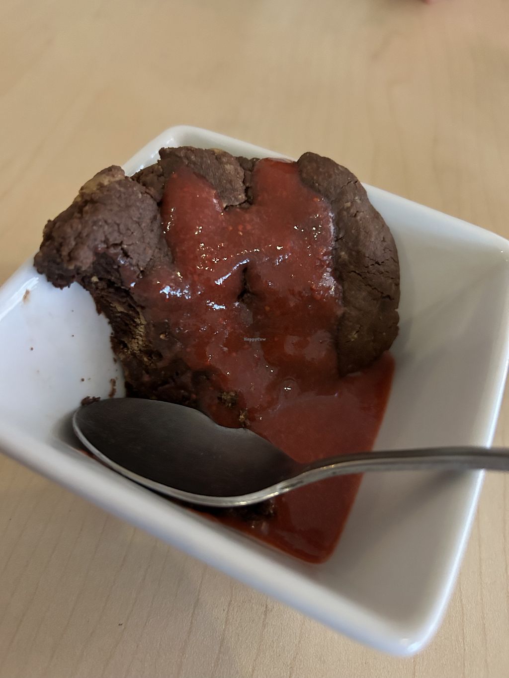 Dessert du jour : truffes au chocolat avec coulis de fraises maison.