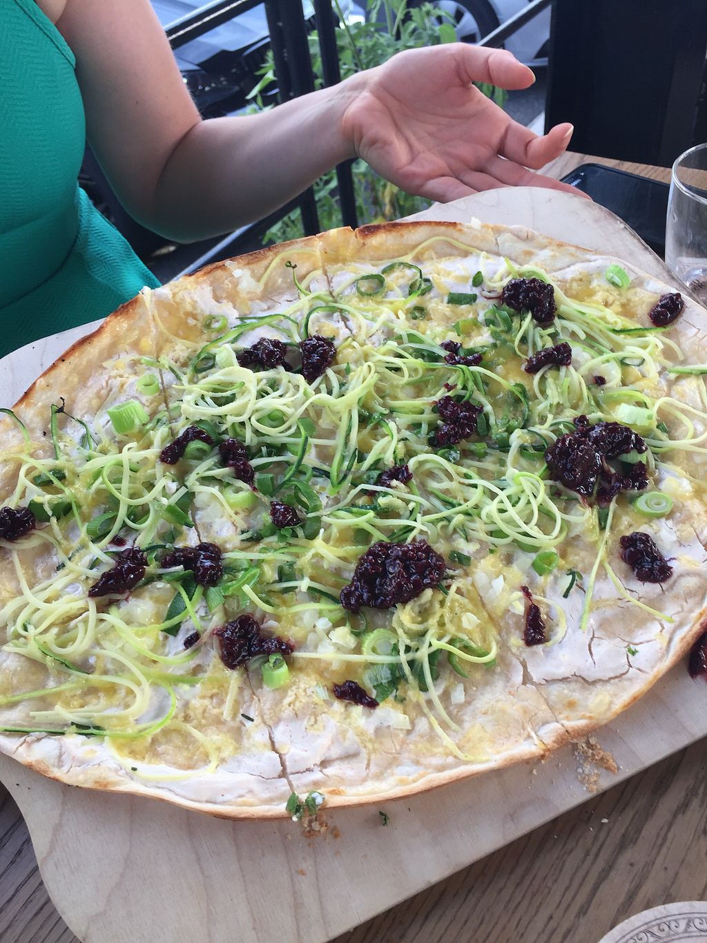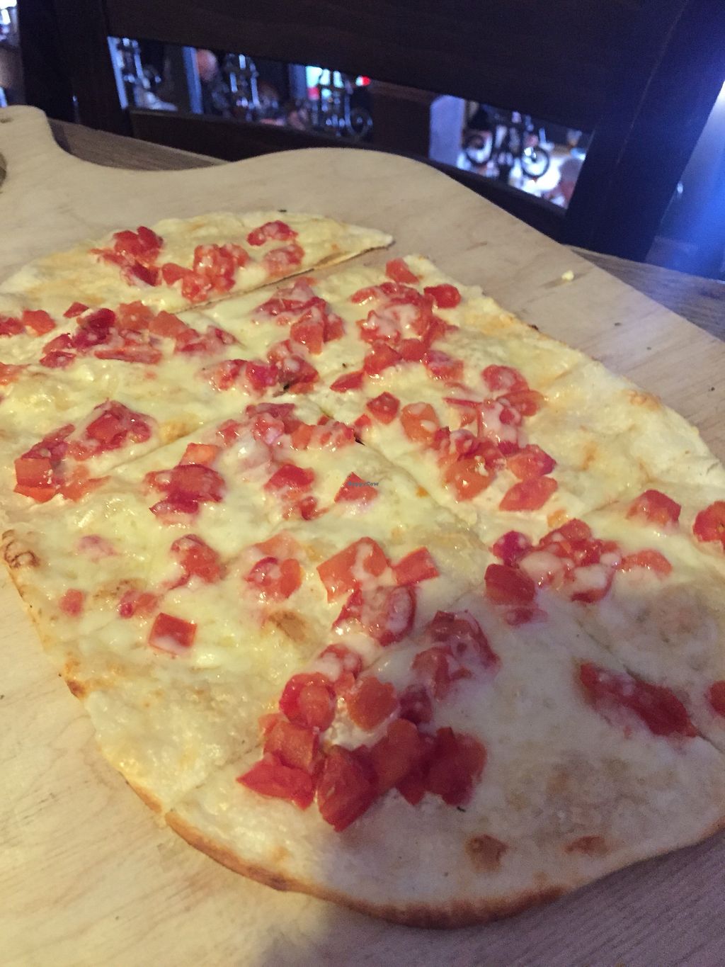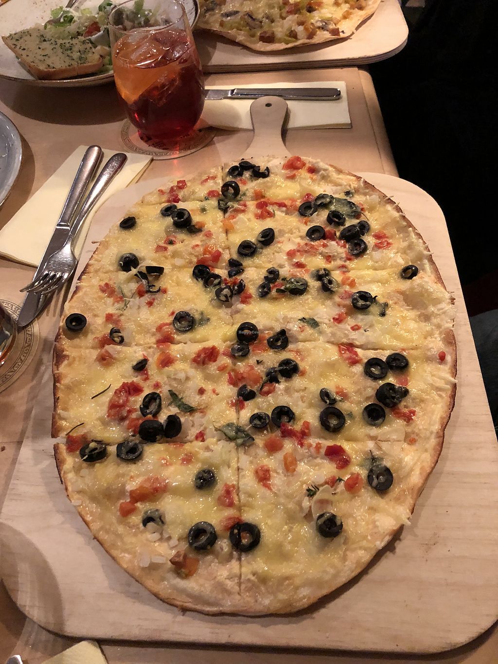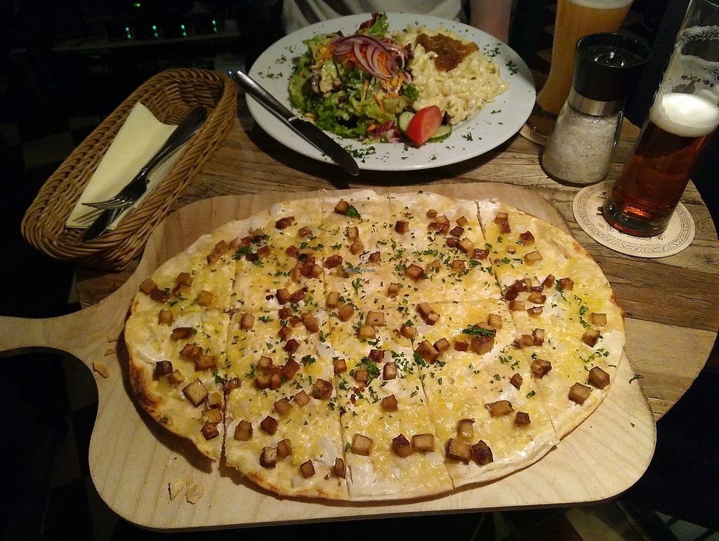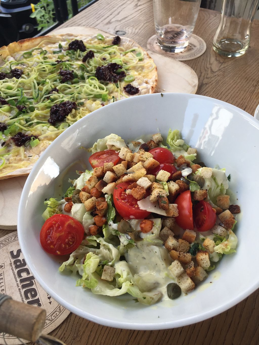 Read moreWe enjoyed some delicious Pilsner, including the Schwarz Pils (highly recommend!). Then we ordered the vegan Caesar salad and I had the vegan Mediterranean flammkuchen (any of their flammkuchen can be made vegan) and my friend got the fall special flammkuchen, which had pears, walnuts and a blue cheese sauce. The vegan flammkuchen was DELICIOUS, and while my friend really enjoyed hers, she actually liked the vegan cheese/cream sauce better. It was tangy and delicious. The flammkuchens are massive, but because the crust/bread is soo thin, it’s doable to finish. Also could split one and get something else. The Caesar salad was huge and not bad, but I’m not sure I would necessarily recommend it - the dressing didn’t taste much like Caesar, which was a bummer! But the salad was huge and came with things like chickpeas and tomatoes.