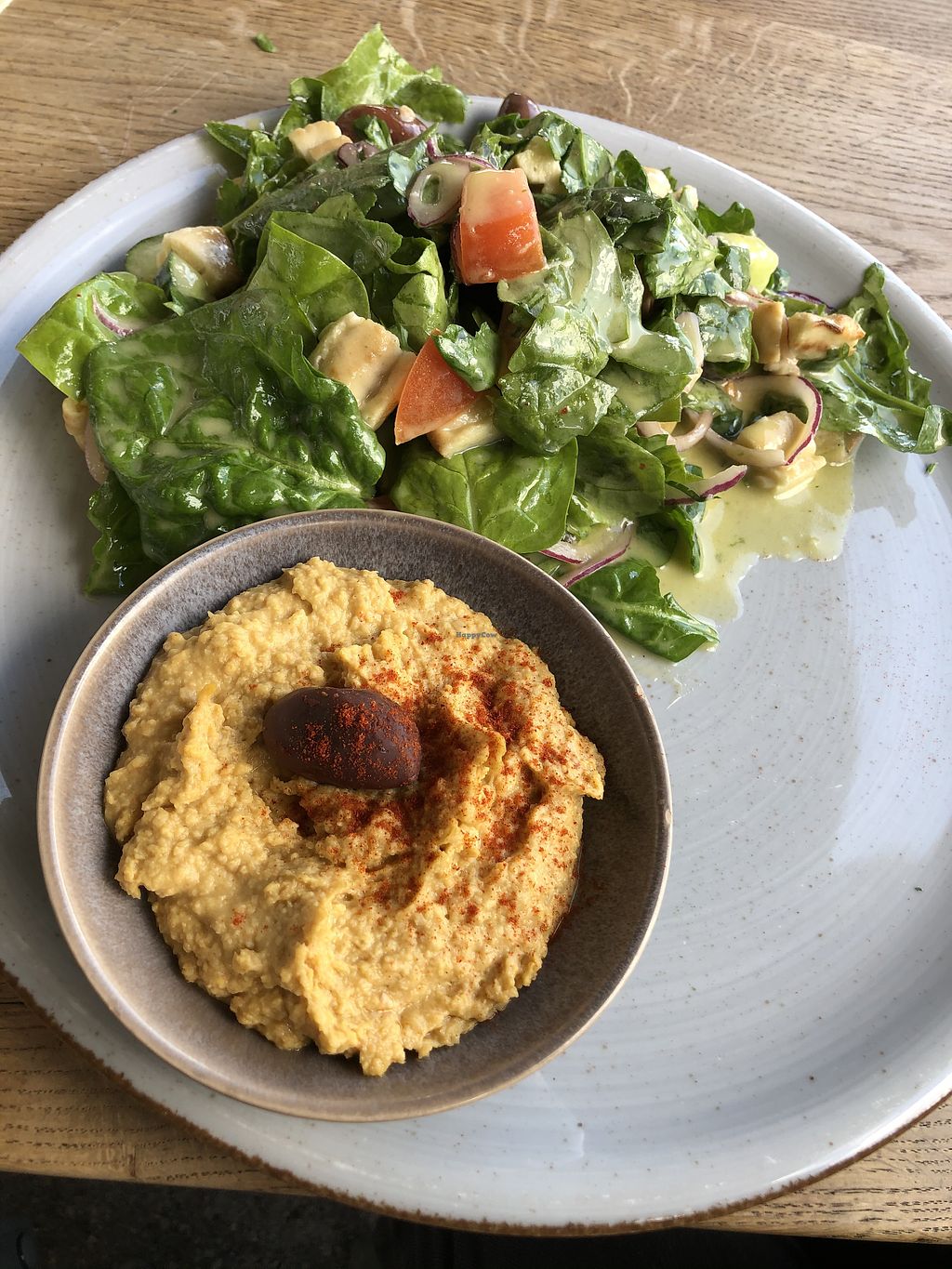 Gute Auswahl. Vieles als vegan bestellbar (Flammkuchen), auch leckere Desserts. Die meisten Salatsoßen und Dips sind vegan
