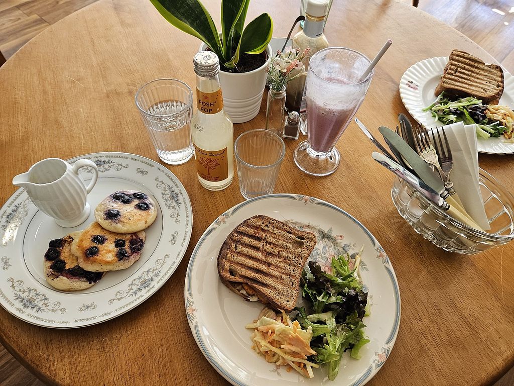 Cute vintage style cafe serving hot and cold food, cakes, also a prebookable afternoon tea. I had the blueberry pancakes with bacun, a fruit scone with coconut cream and jam, and a lovely oat latte. Dog friendly cafe, on street free parking.