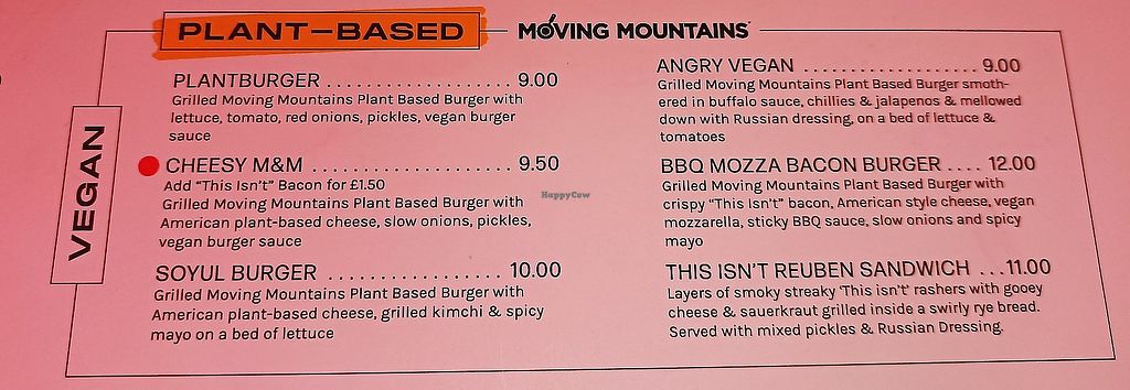 Serves meat, vegan options available. Has a vegan section in the menu with several vegan burgers and sandwiches using Moving Mountains patty, This Isn't Bacon, plant-based cheese and vegan burger sauce. One of a few branches. Open Mon-Thu 11:30-20:30, Fri-Sat 11:30-21:30, Sun 11:30-20:30.