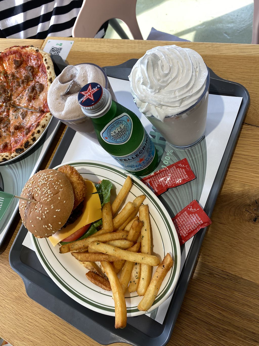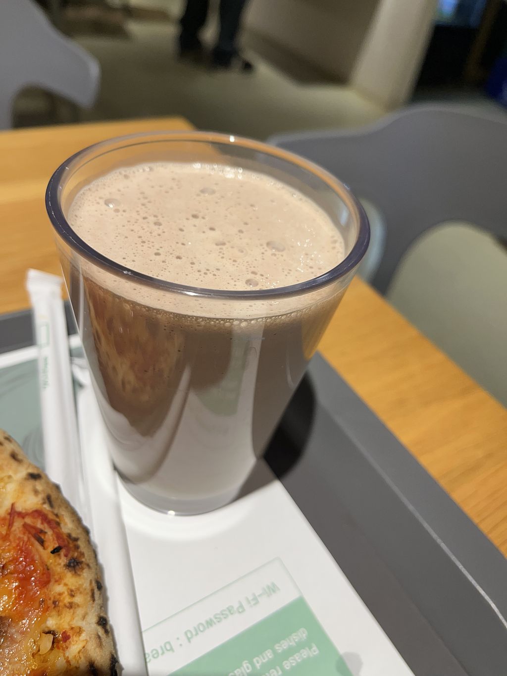 Vanilla milkshake with whip, chocolate drink, sparkling water