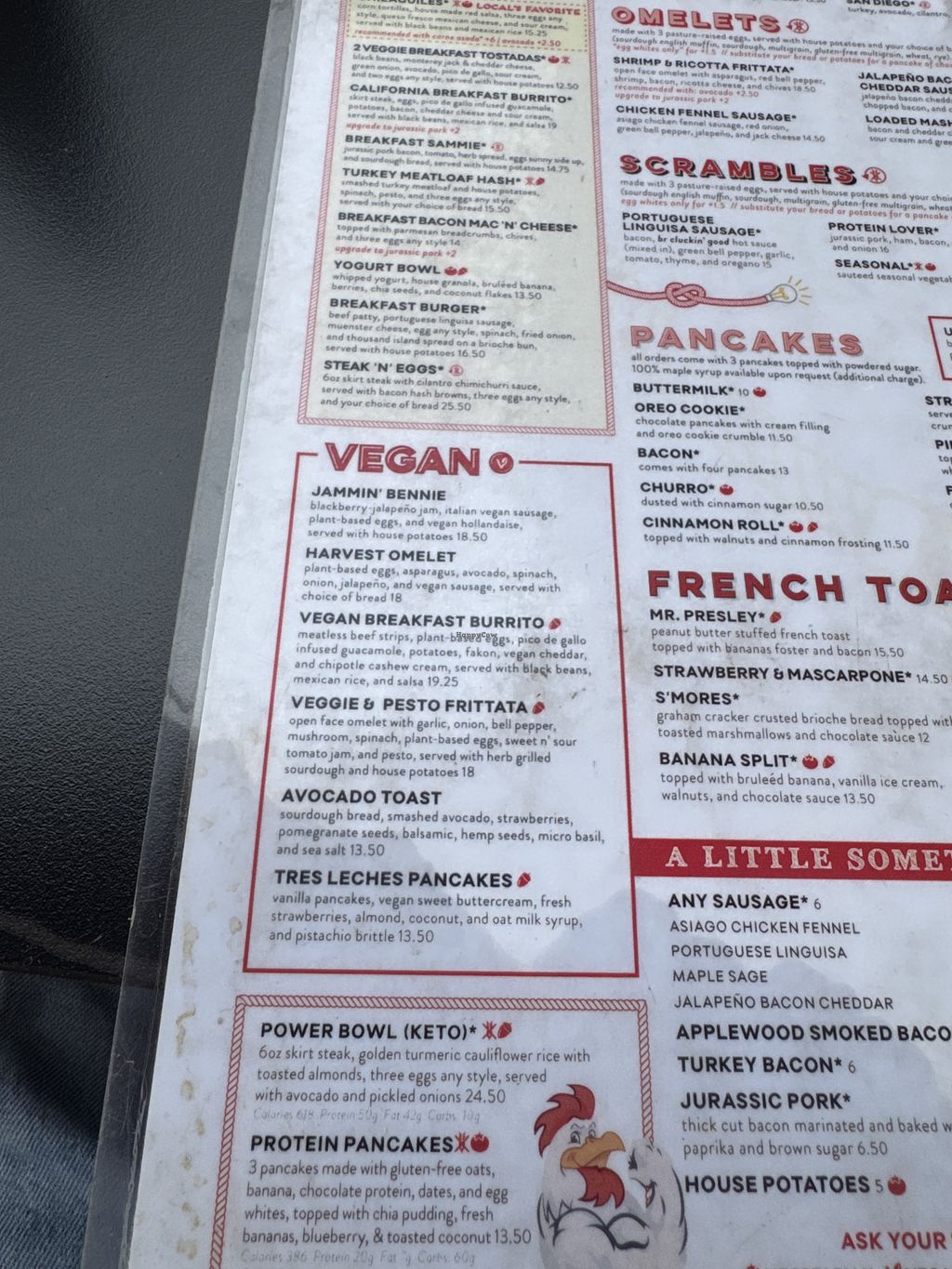 Serves meat, vegan options available. Breakfast restaurant with several branches in SD. Has vegan menu that includes a few dishes using Just's Vegan Egg. Choices include soy chorizo vegan bowl, jammin' bennies, and harvest omelet served with potatoes. Reported to serve non-vegan butter with vegan orders, ask if there is vegan butter available. House ketchup is reported vegan October 2023. Open Mon-Sun 7:00am-3:00pm.