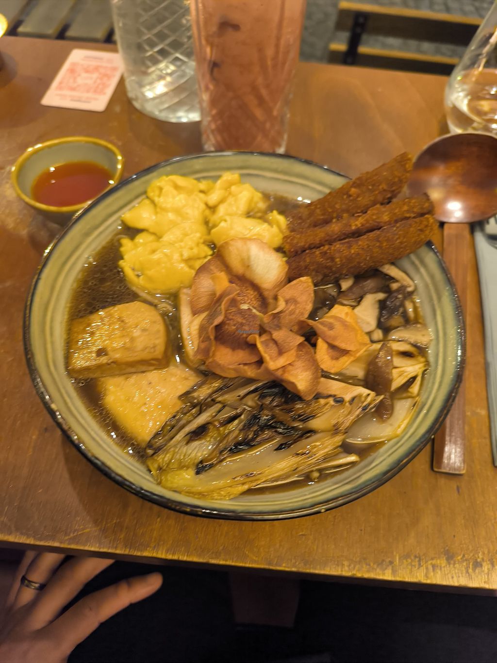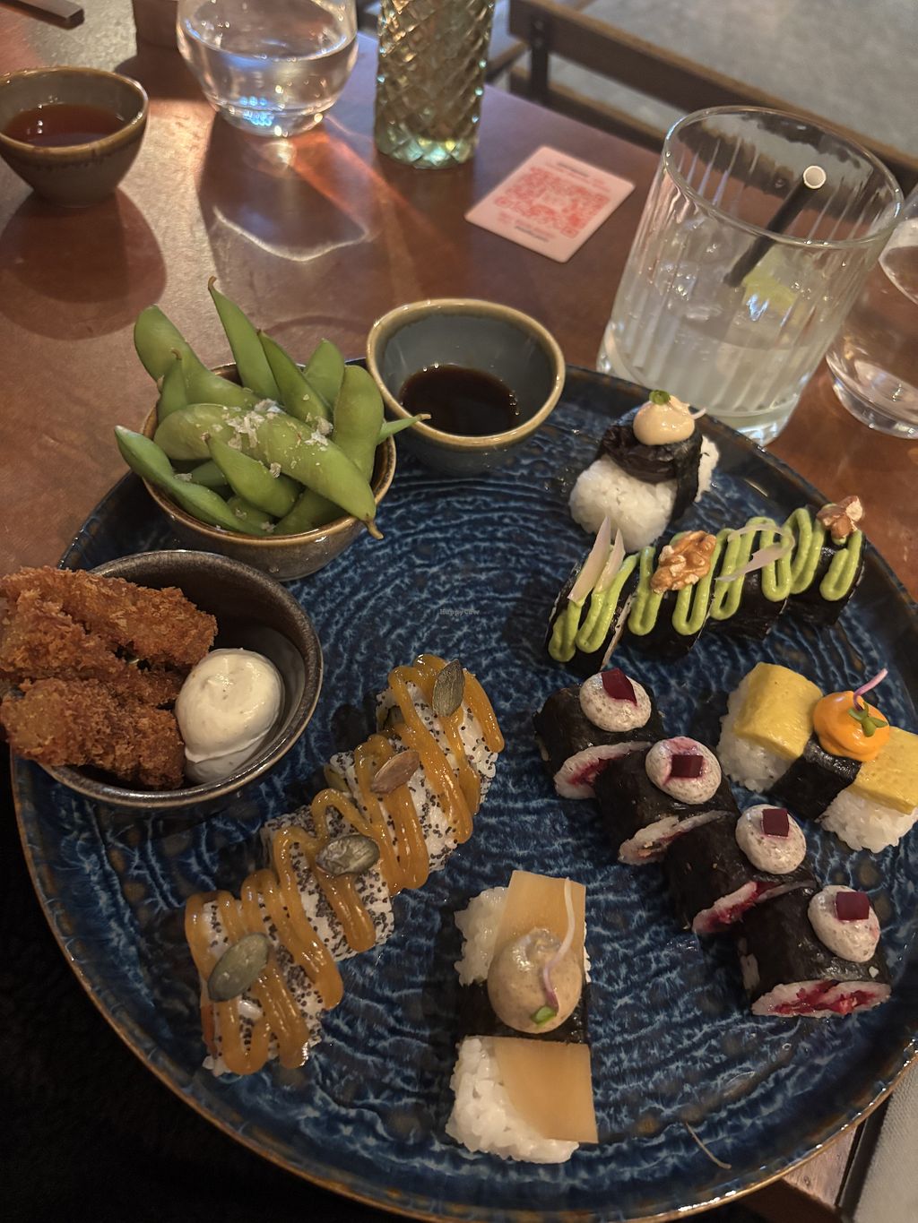 Plum & wasabi nigiri (background), lacquered daikon nigiri (foreground…