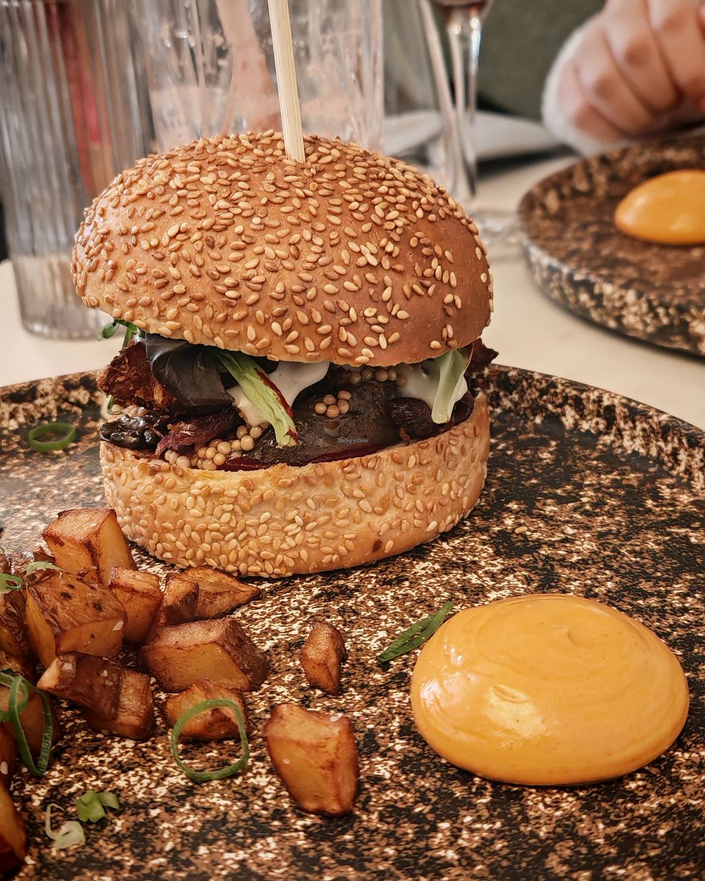 ASIAN STYLE BURGER Crispy seitan with ginger and garlic, salad, melte…