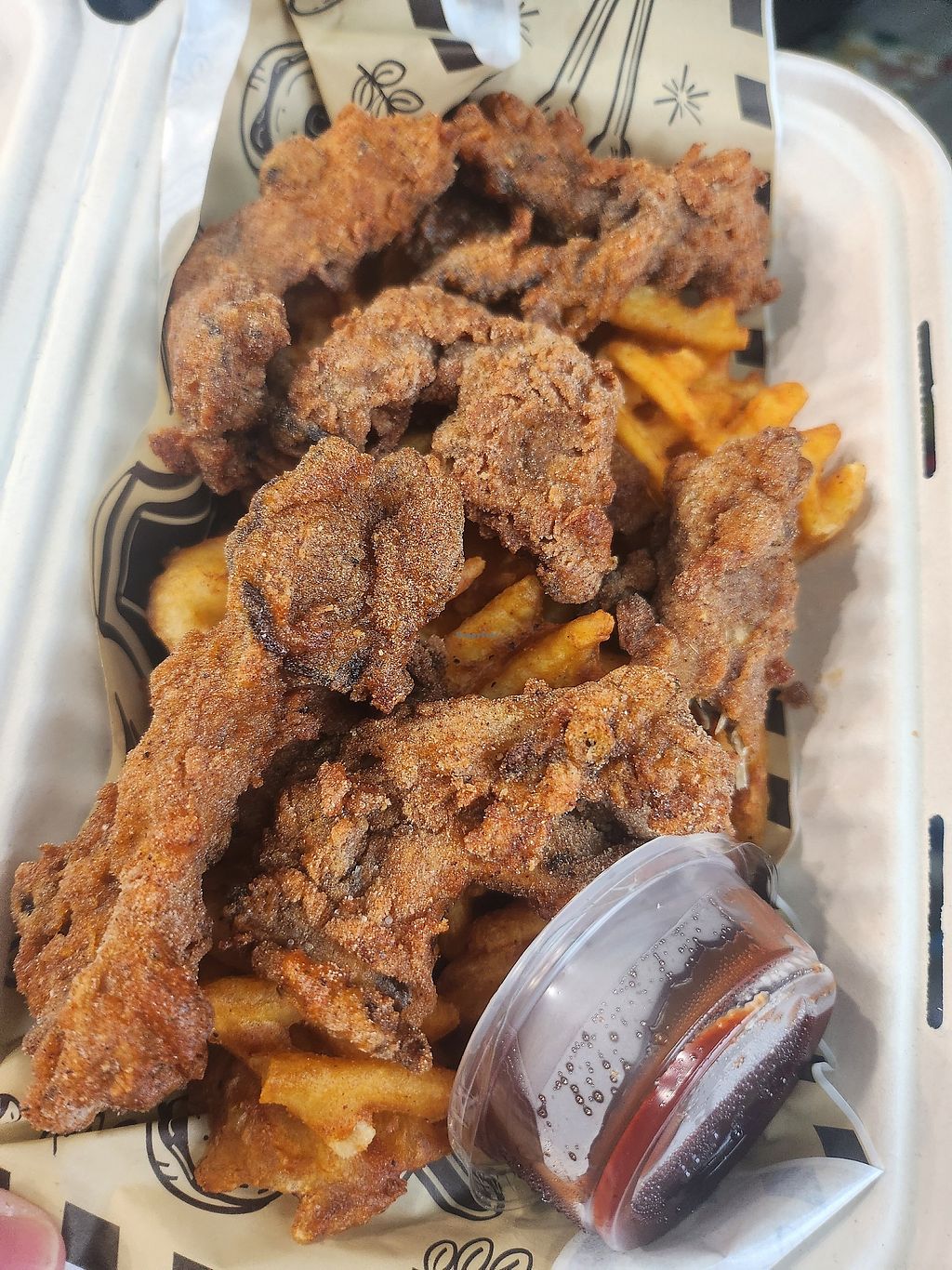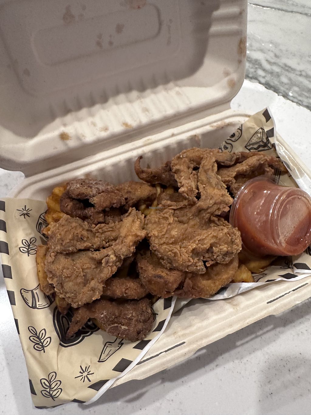 So glad I was finally able to try this 100% vegan, plant based food truck. Very easy ordering and you can wait in your car with a device that notifies you when it is ready. We had the mushroom chicken tenders, waffle fries and Philly cheesesteak sandwiches. All were very good but the Philly cheesesteak was outstanding. Great flavor and loads of plant based cheesesteak. The Mac and cheese was so good too. I tried the lymphatic static juice as well and it was delicious. Can’t wait for their brick and mortar storefront to open but give them a try at the tuck in the meantime!