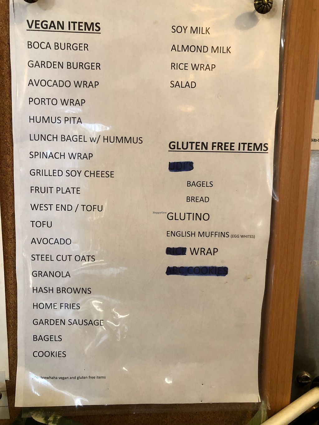 I have eaten at Brewhaha for years. My wife and I go for a great vegan breakfast as often as we can, and our non-vegan friends share our enthusiasm. We particularly enjoy the 'West End Scramble' made with Tofu. There is also a great vegan 'Tofu Breakfast Sandwich'. Great staff, great atmosphere. It can get crowded at certain times of day, but worth the wait..
