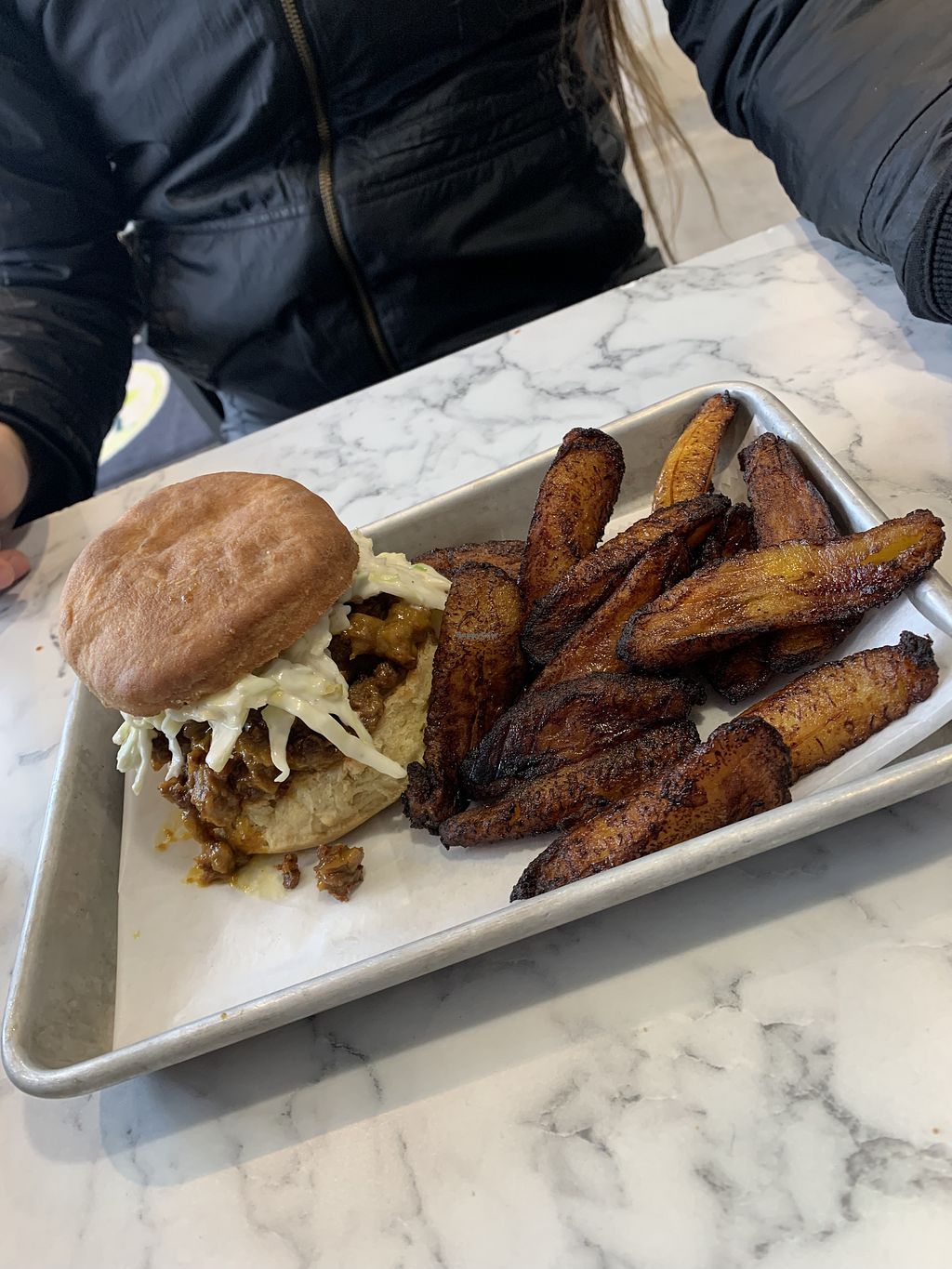 I ordered the Philly cheesesteak )which is made from “pulled oats”) with a side of plantains. Can’t say it was the most memorable meal I’ve ever had at a vegan place. Overall, not bad