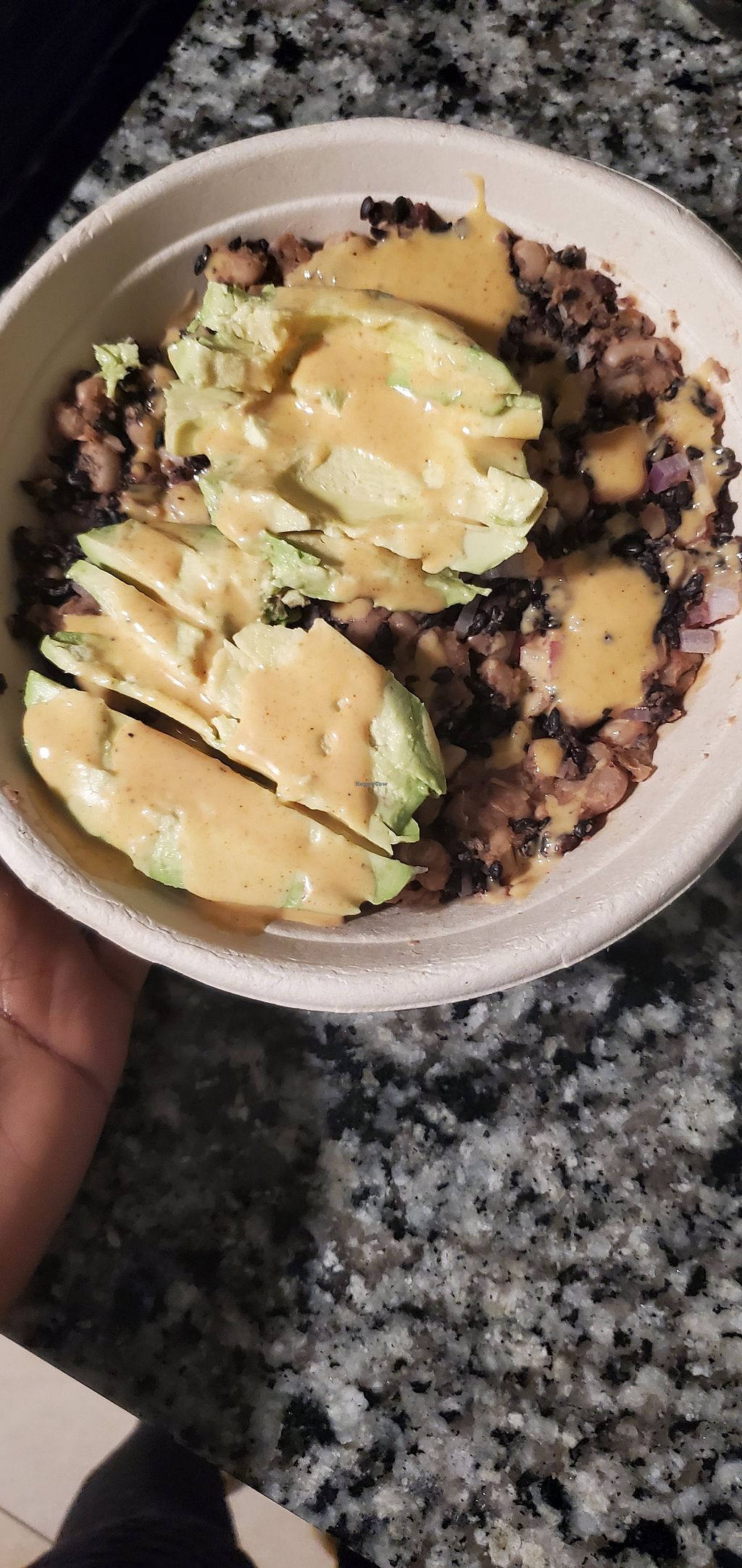 I ordered the power bowl with black beans, onions and black rice. Since I had avocados at home because I wasn't paying an extra $1 to add them. I love beans and rice. I got the yum yum sauce.